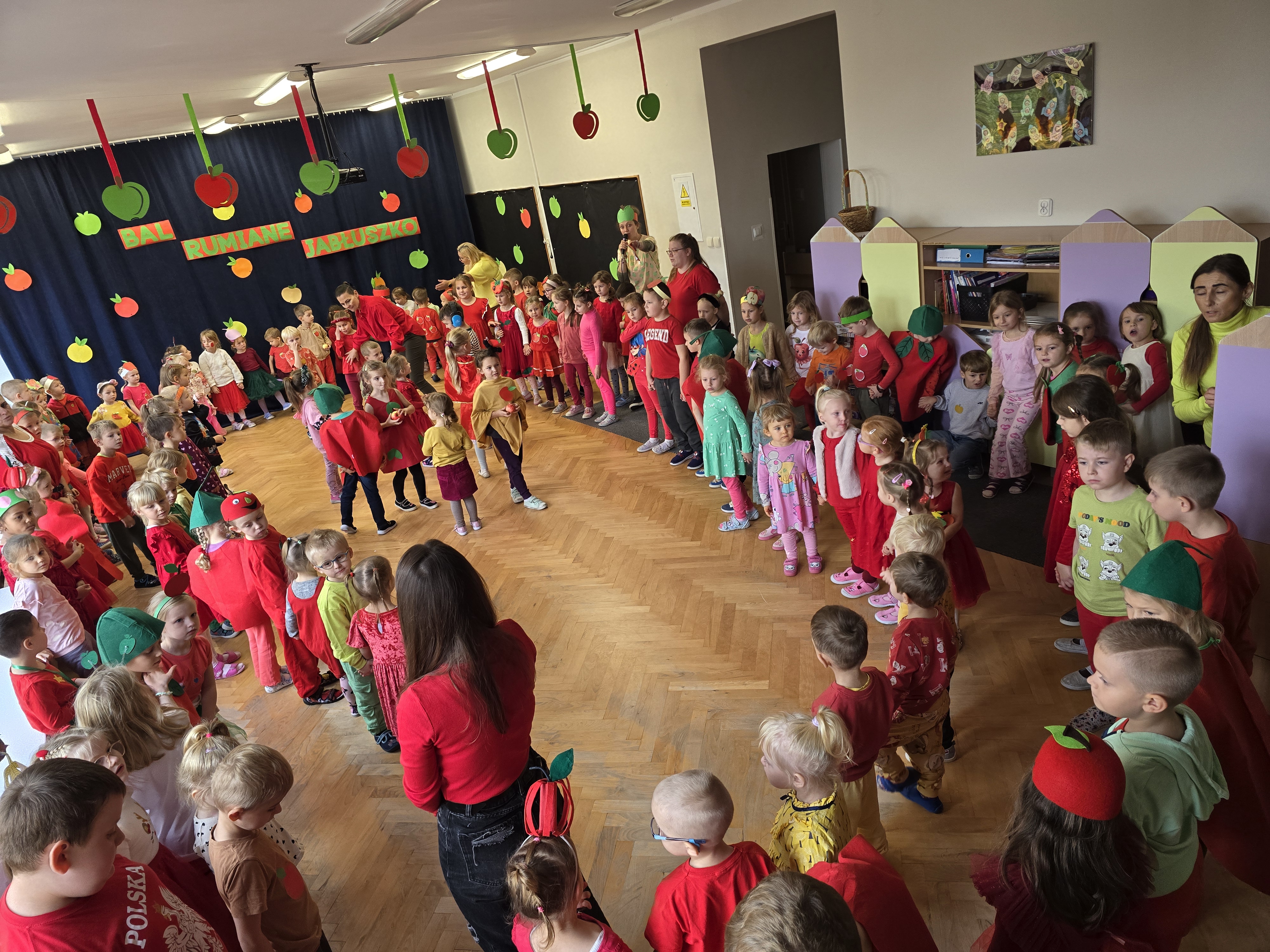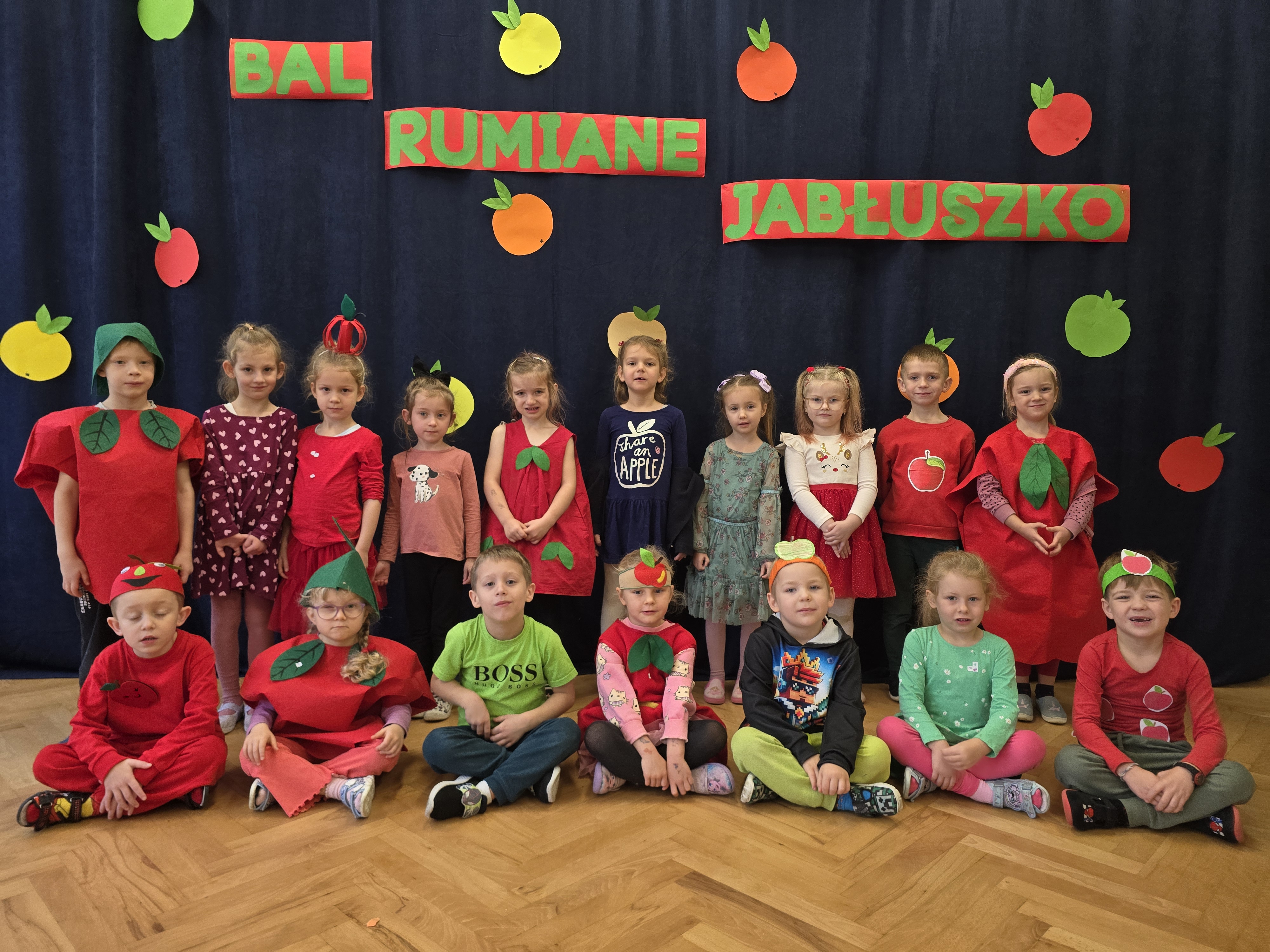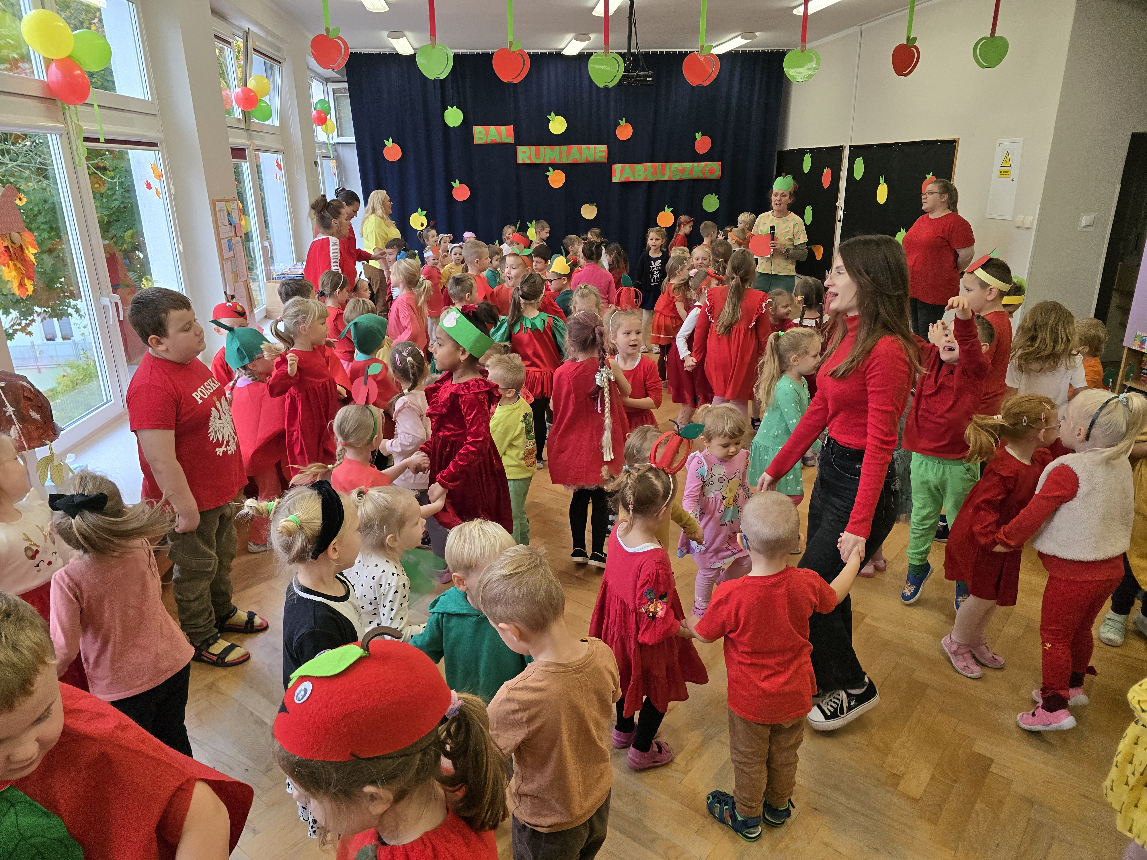 17 października w naszym przedszkolu odbył się kolorowy i radosny Bal „Rumiane Jabłuszko”, który wprowadził wszystkich w jesienny nastrój. Dzieci przyszły ubrane w przepiękne, pomysłowe stroje inspirowane jabłkami i barwami jesieni – w sali królowały czerwienie, zielenie i złociste odcienie.