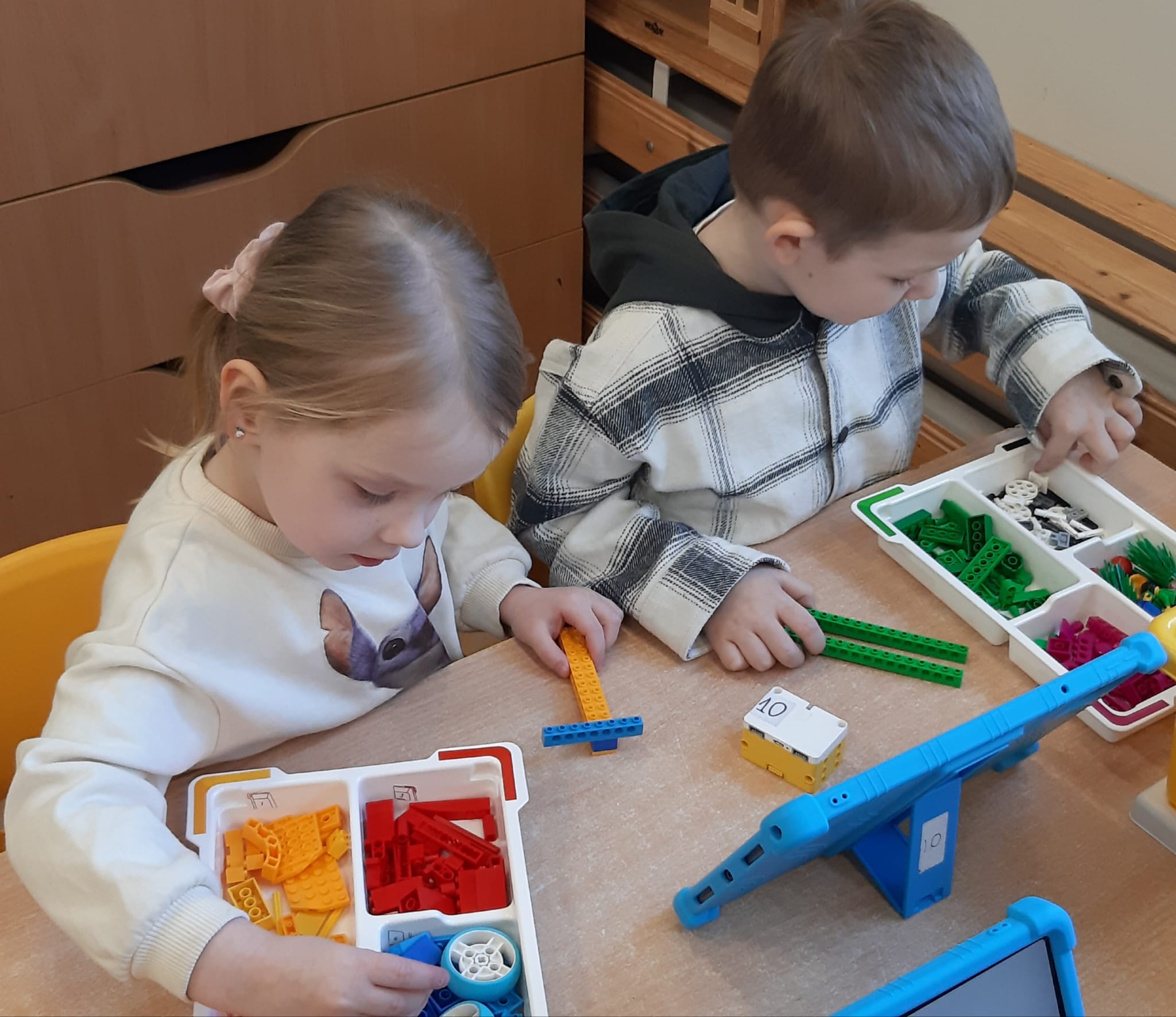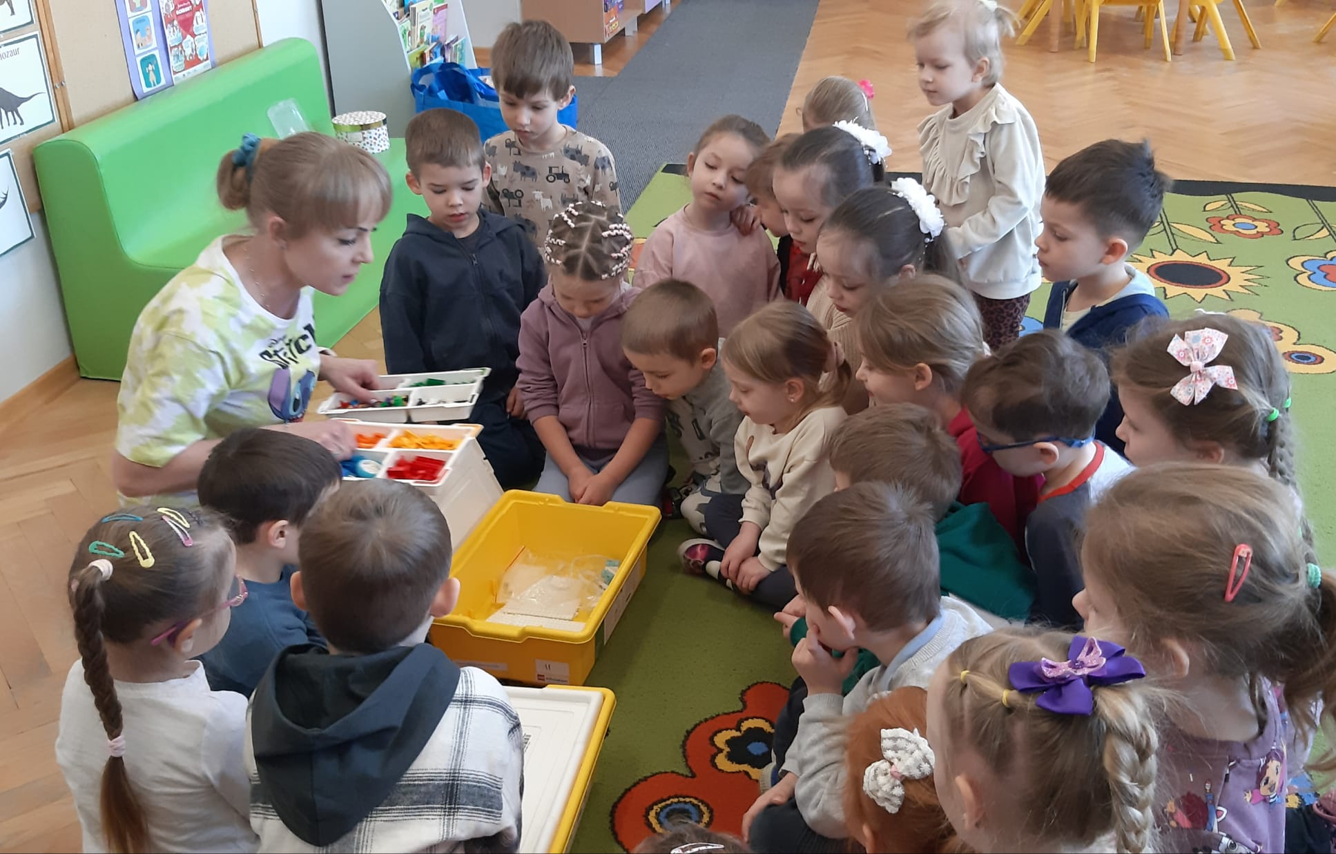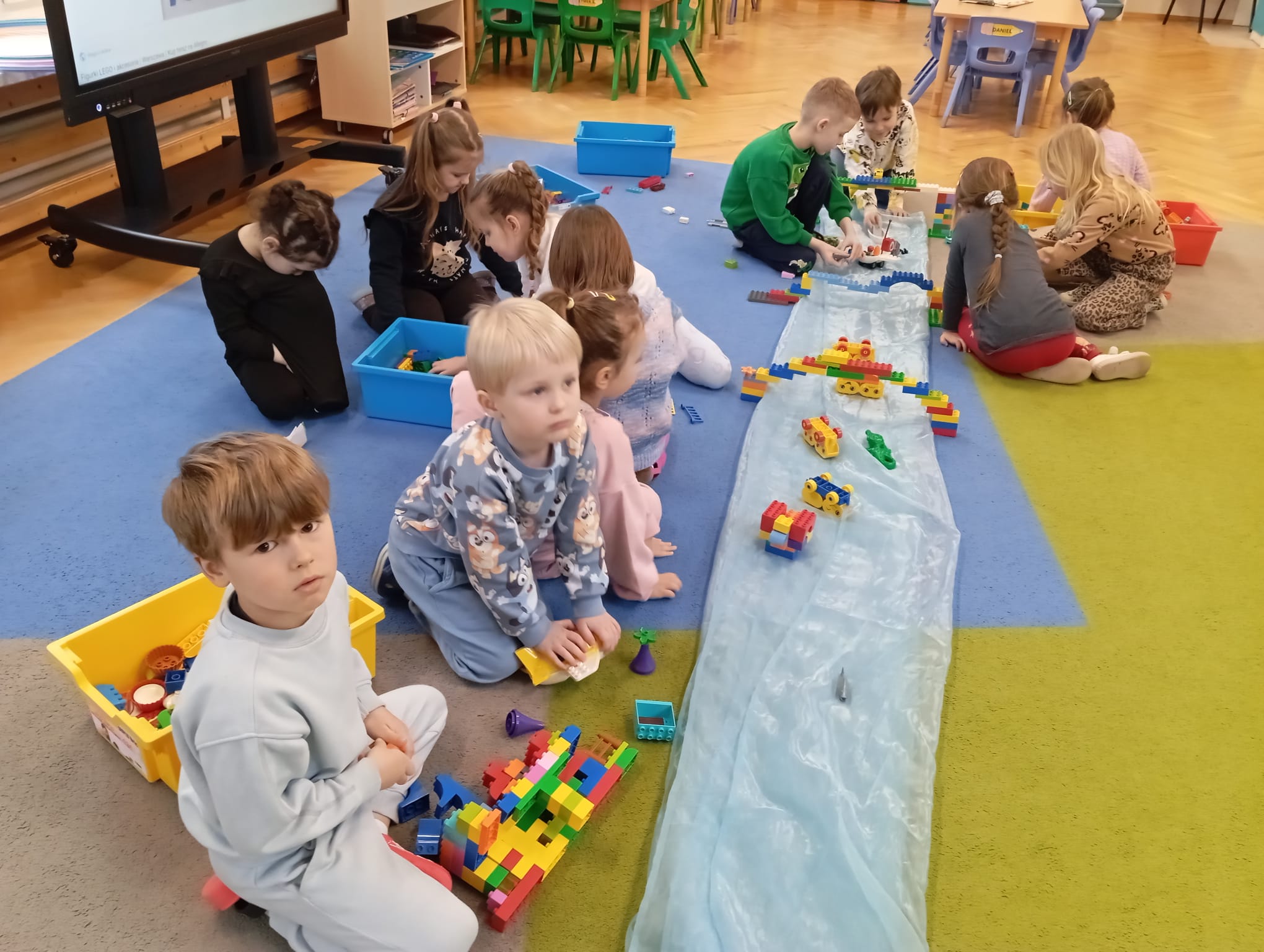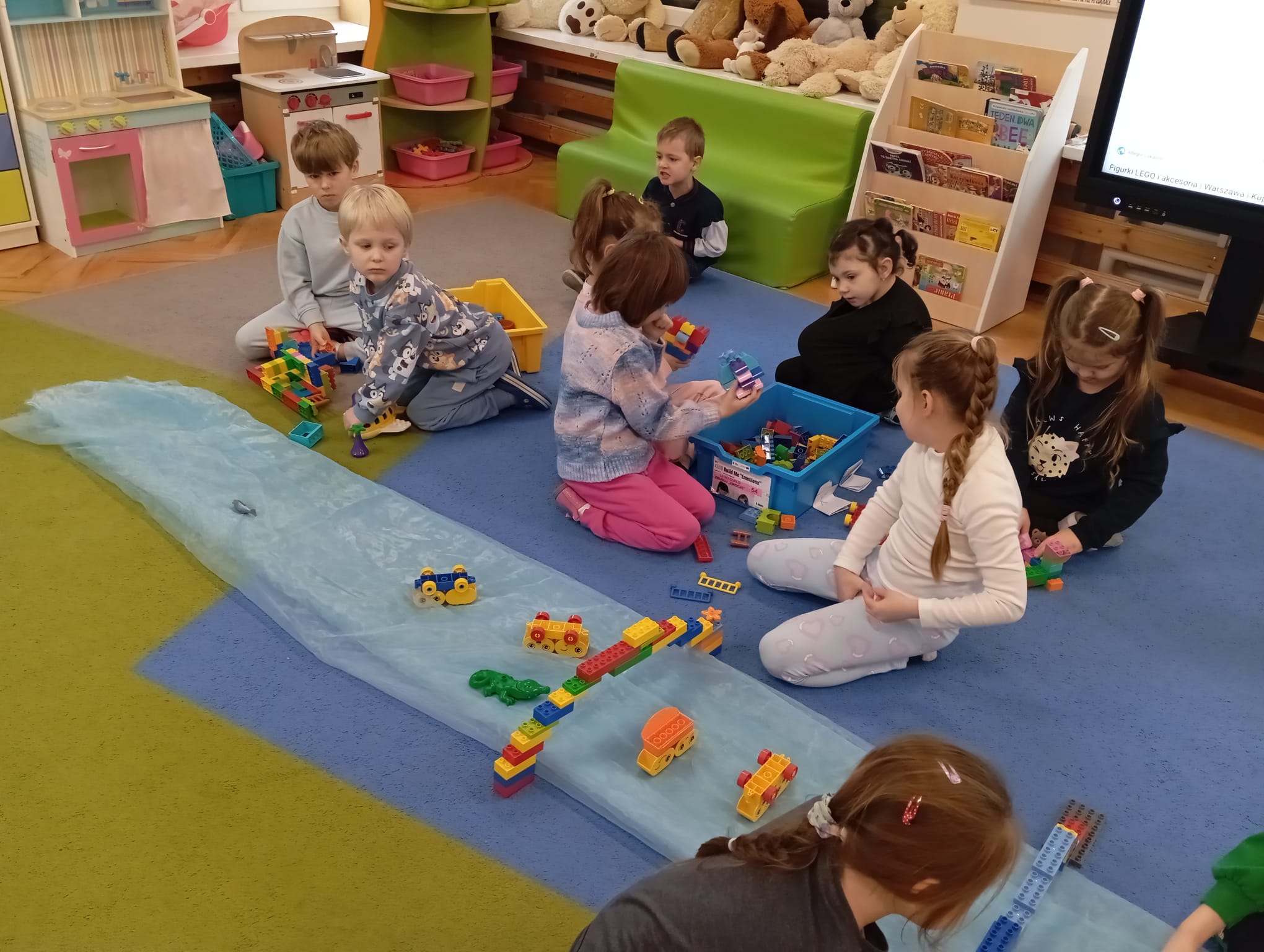 Przedszkolaki z ogromnym zaangażowaniem budowały różnorodne konstrukcje – powstawały domy, pojazdy, wieże, a także fantastyczne budowle stworzone według własnej wyobraźni. Wspólna zabawa klockami rozwijała kreatywność, wyobraźnię przestrzenną oraz umiejętność współpracy w grupie.