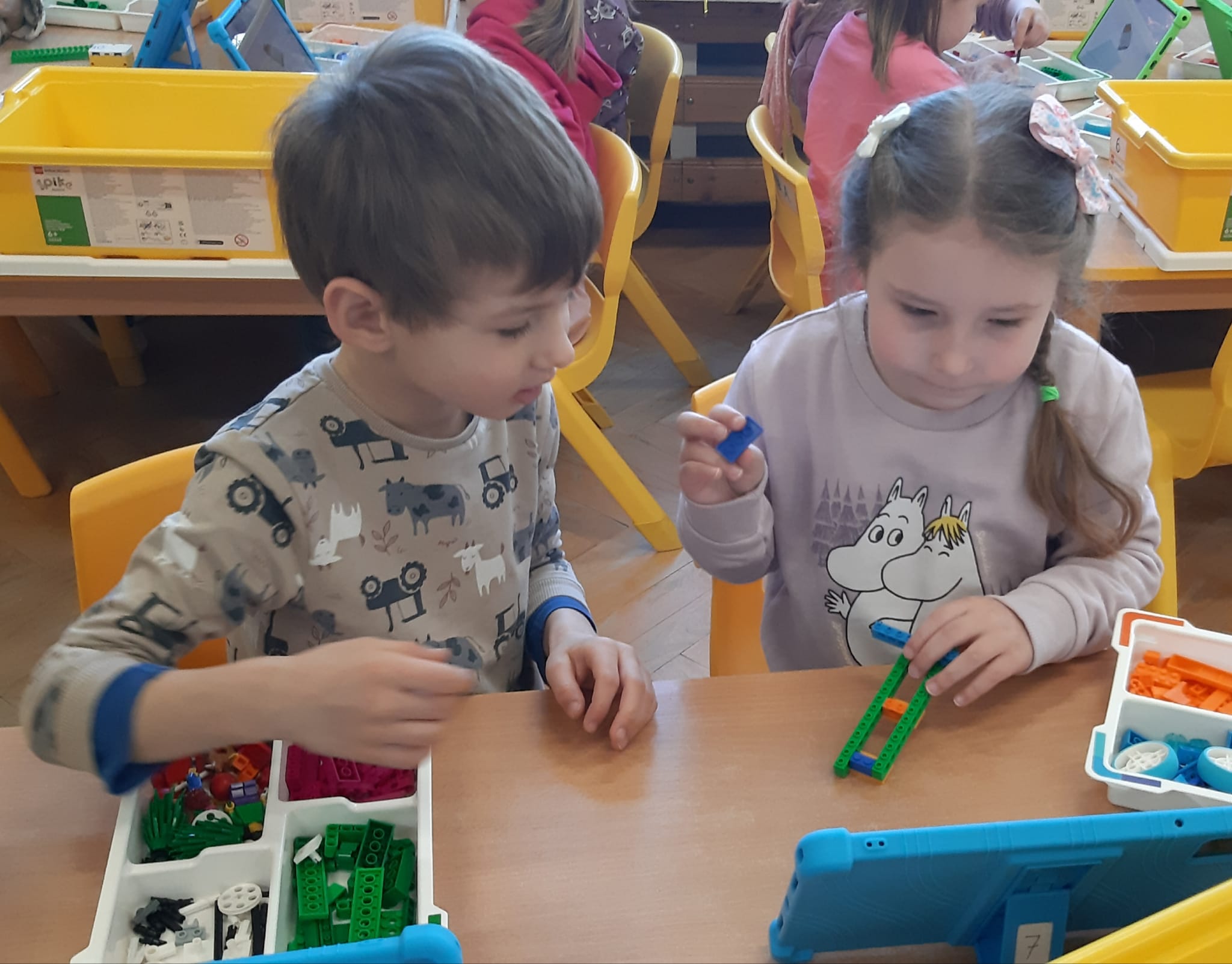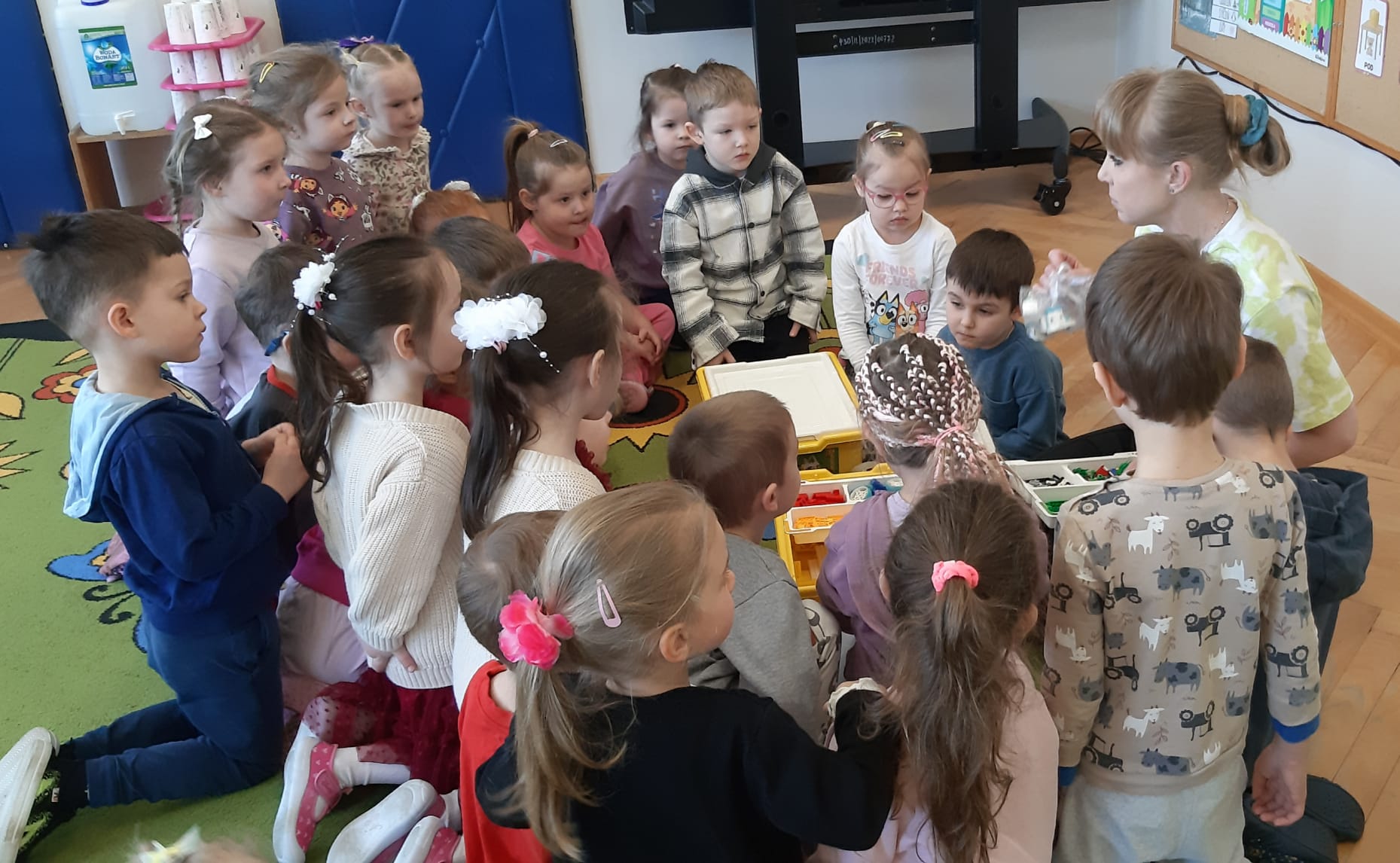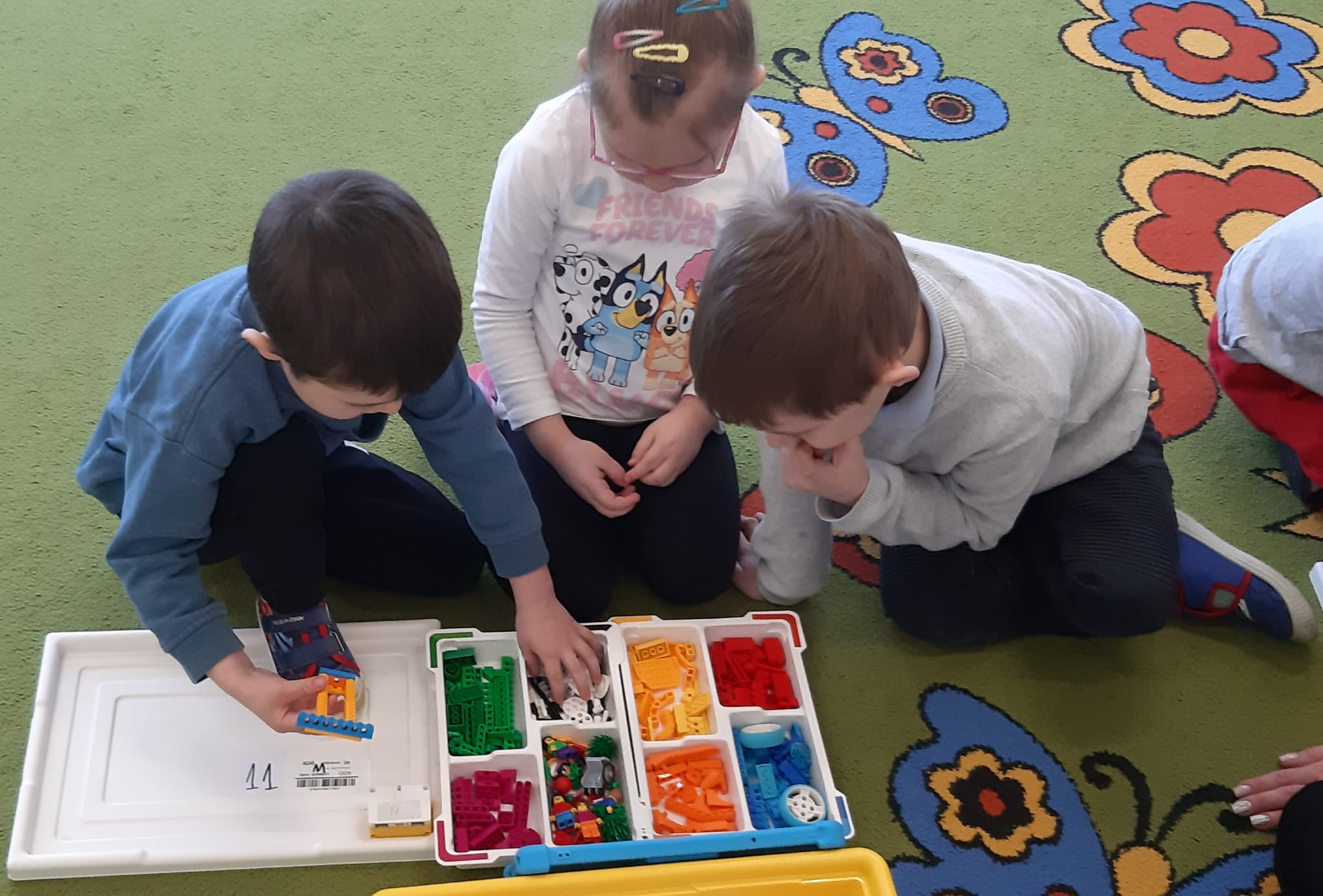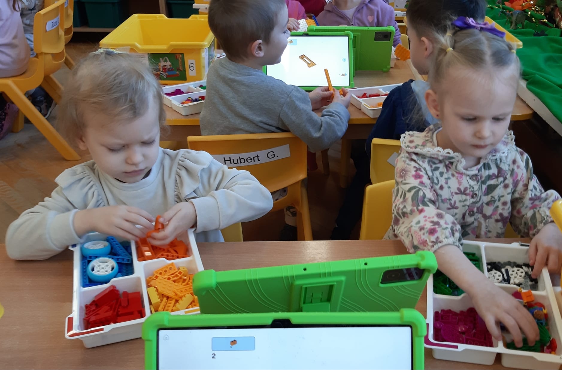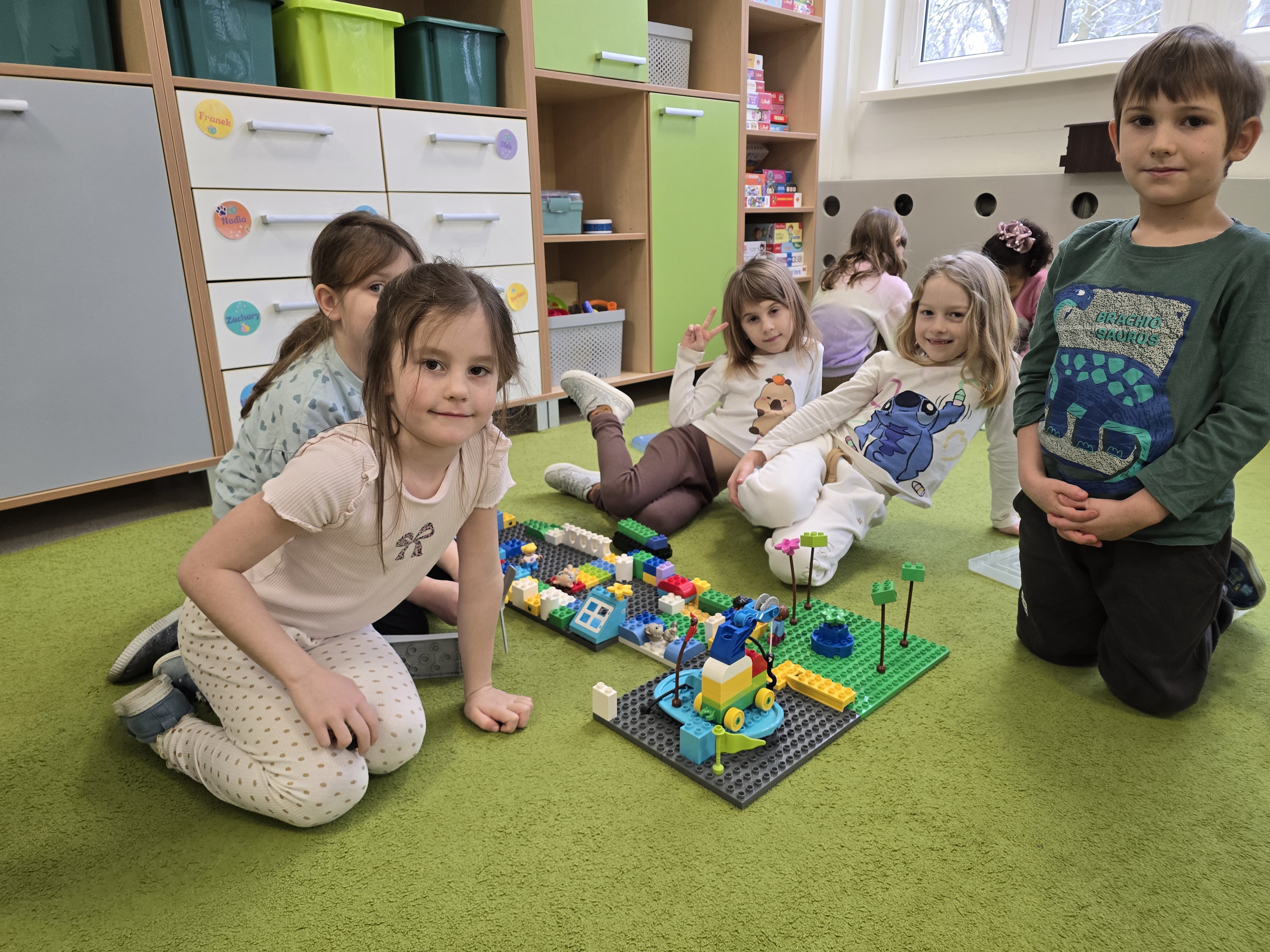 Przedszkolaki z ogromnym zaangażowaniem budowały różnorodne konstrukcje – powstawały domy, pojazdy, wieże, a także fantastyczne budowle stworzone według własnej wyobraźni. Wspólna zabawa klockami rozwijała kreatywność, wyobraźnię przestrzenną oraz umiejętność współpracy w grupie.