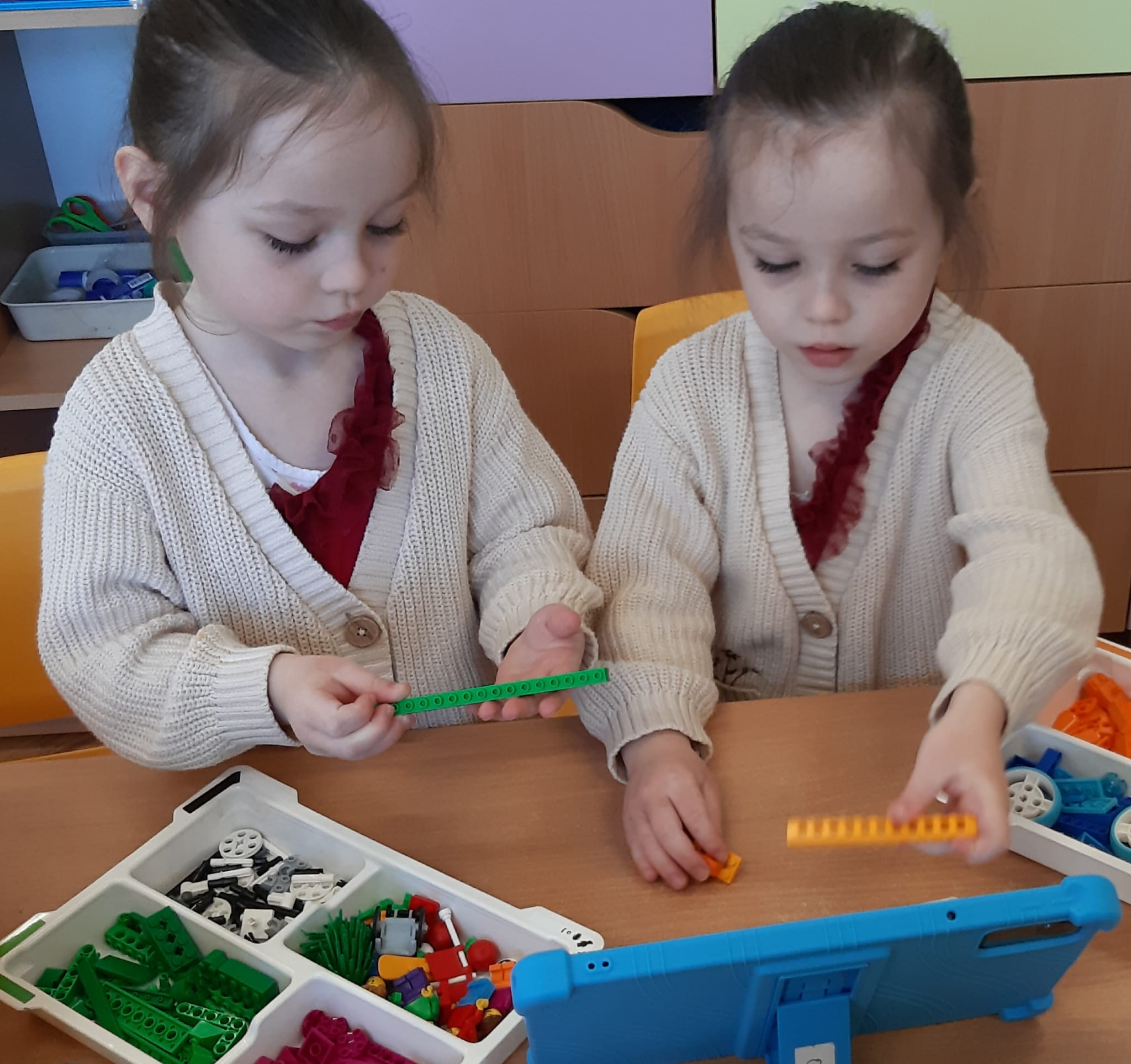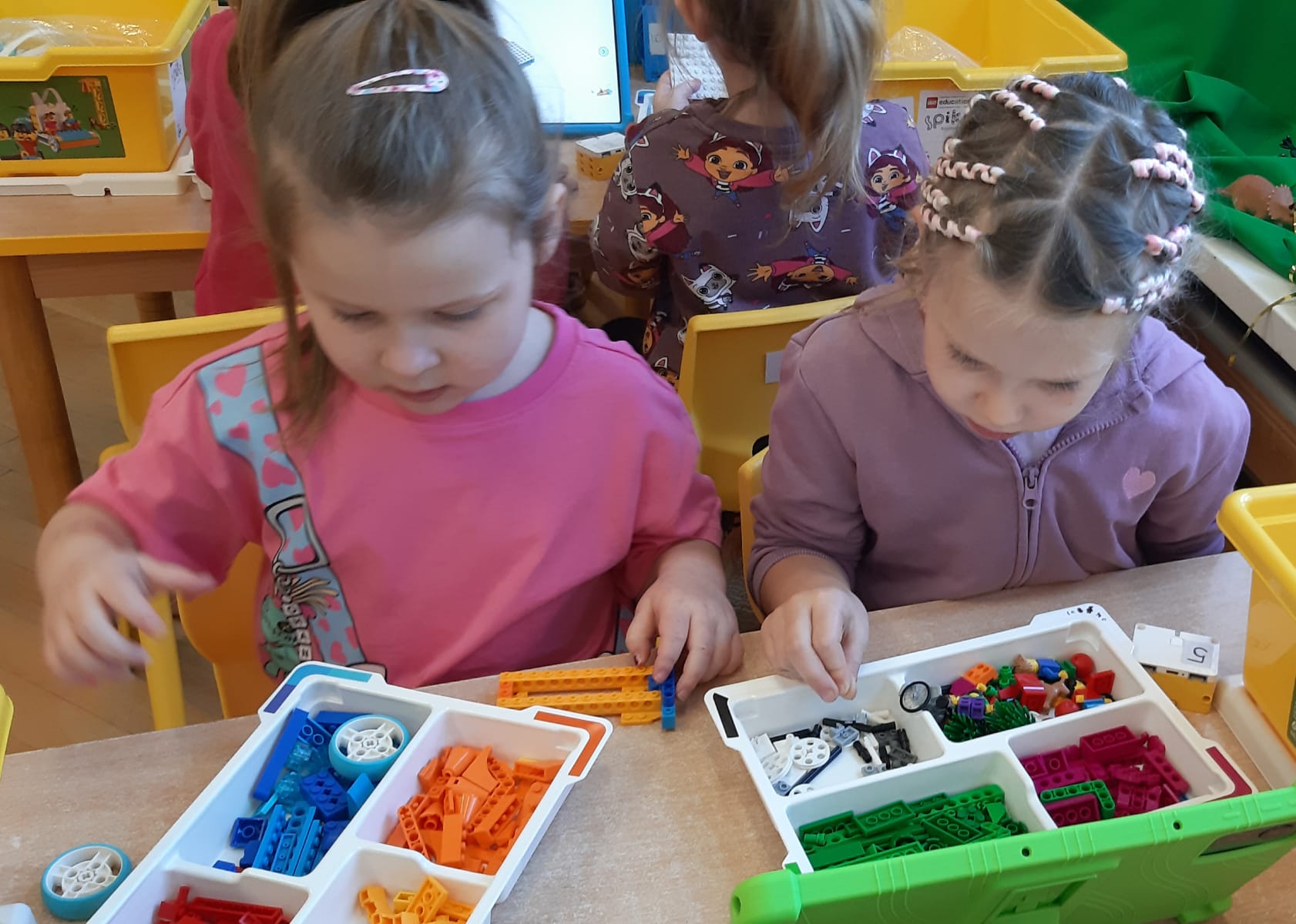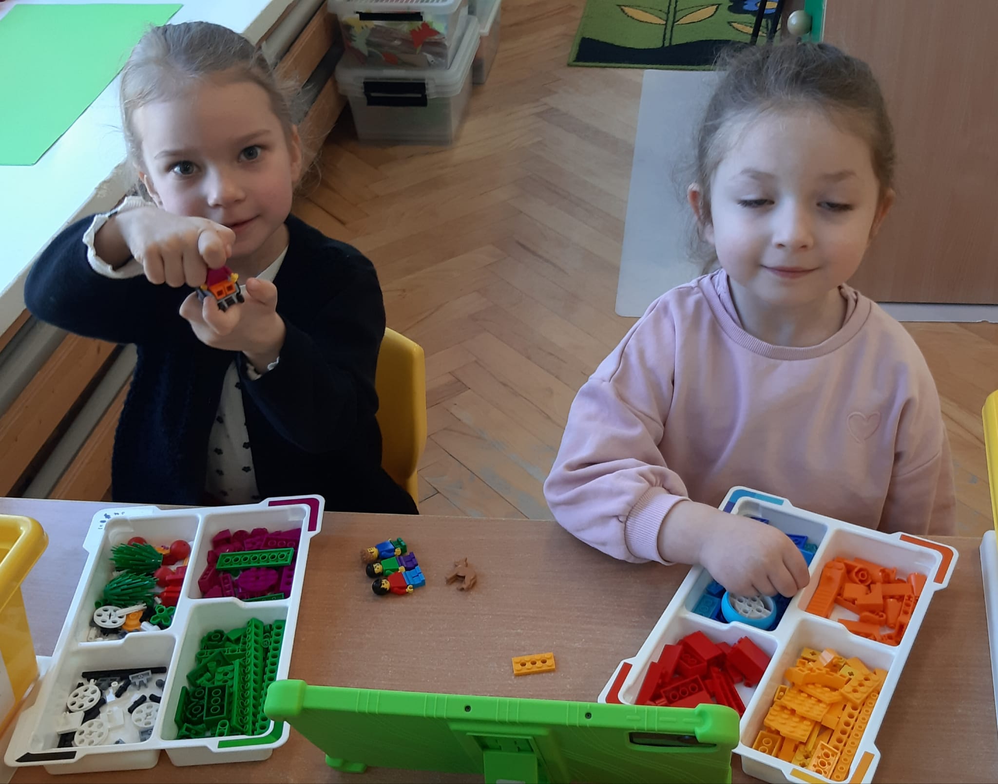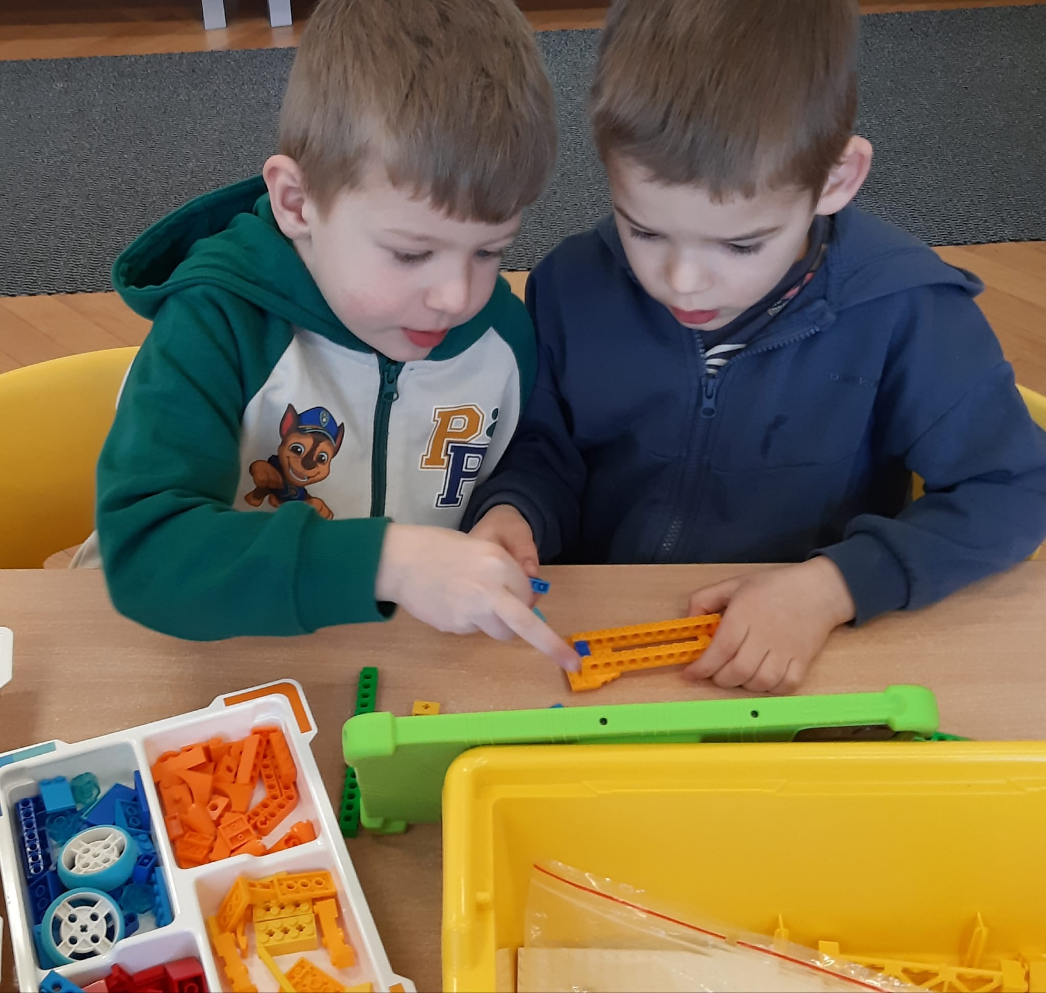 Przedszkolaki z ogromnym zaangażowaniem budowały różnorodne konstrukcje – powstawały domy, pojazdy, wieże, a także fantastyczne budowle stworzone według własnej wyobraźni. Wspólna zabawa klockami rozwijała kreatywność, wyobraźnię przestrzenną oraz umiejętność współpracy w grupie.