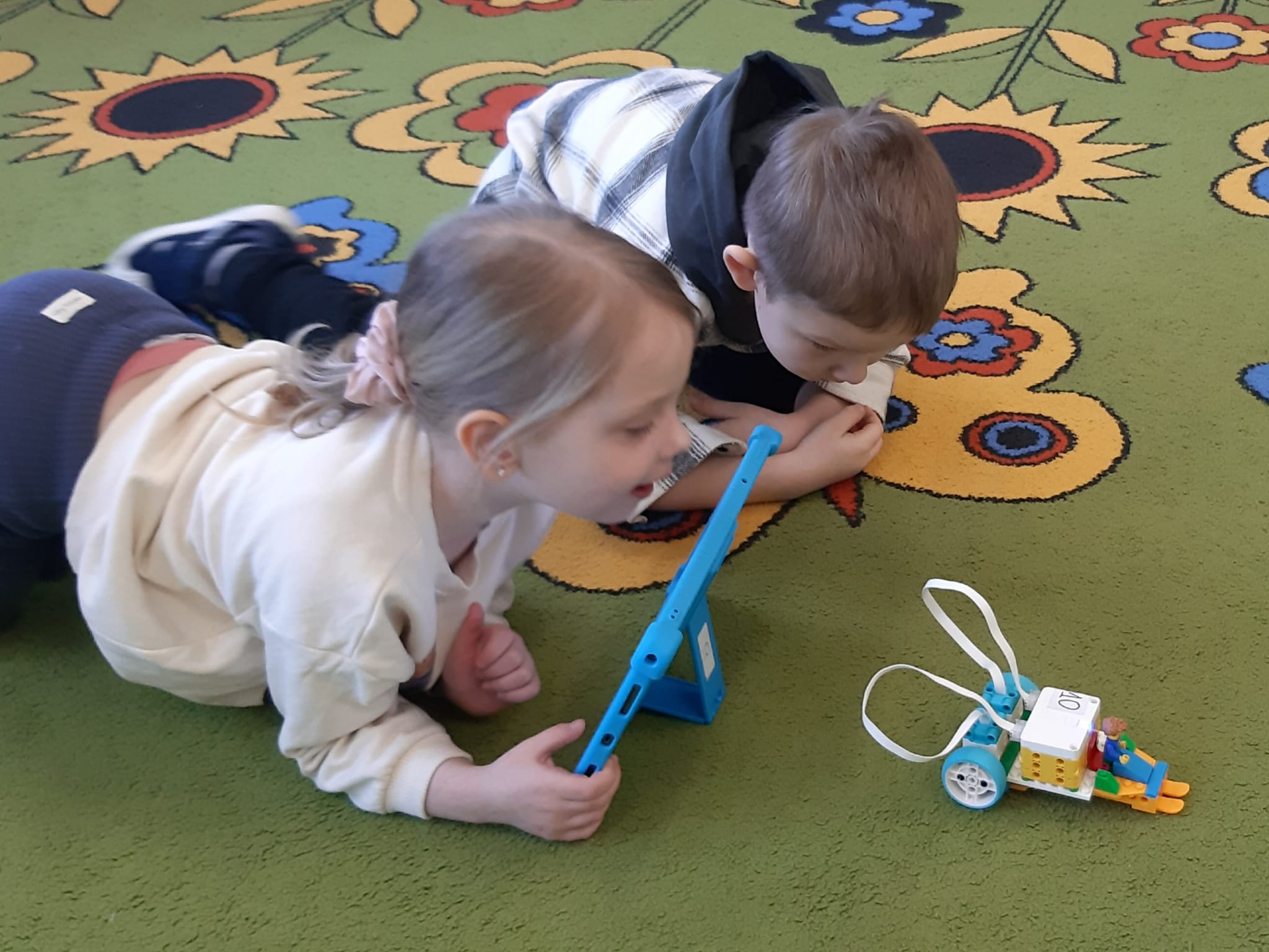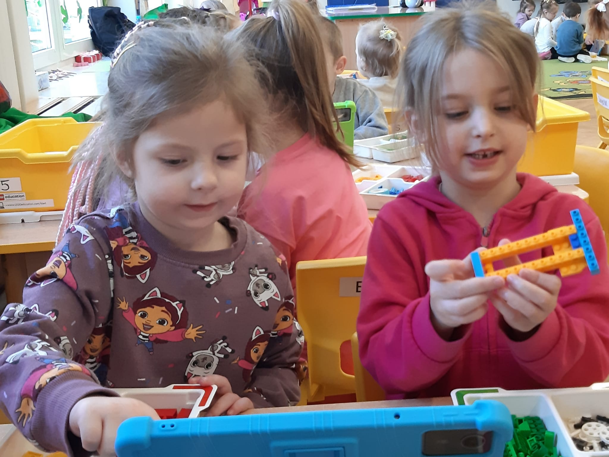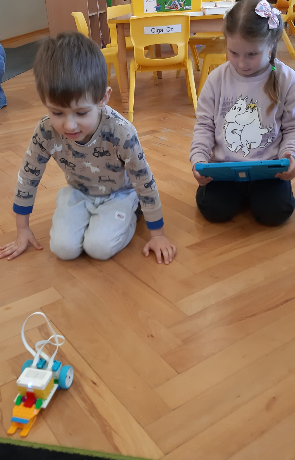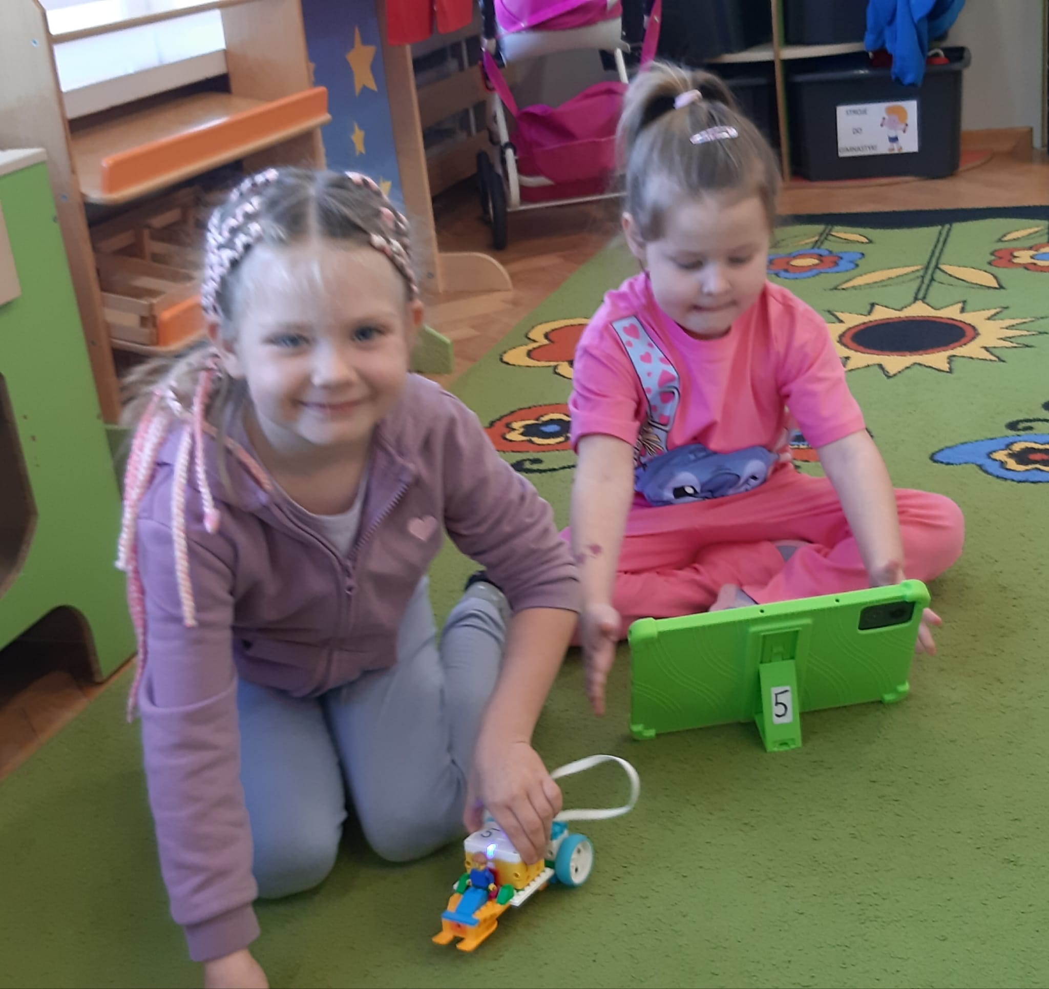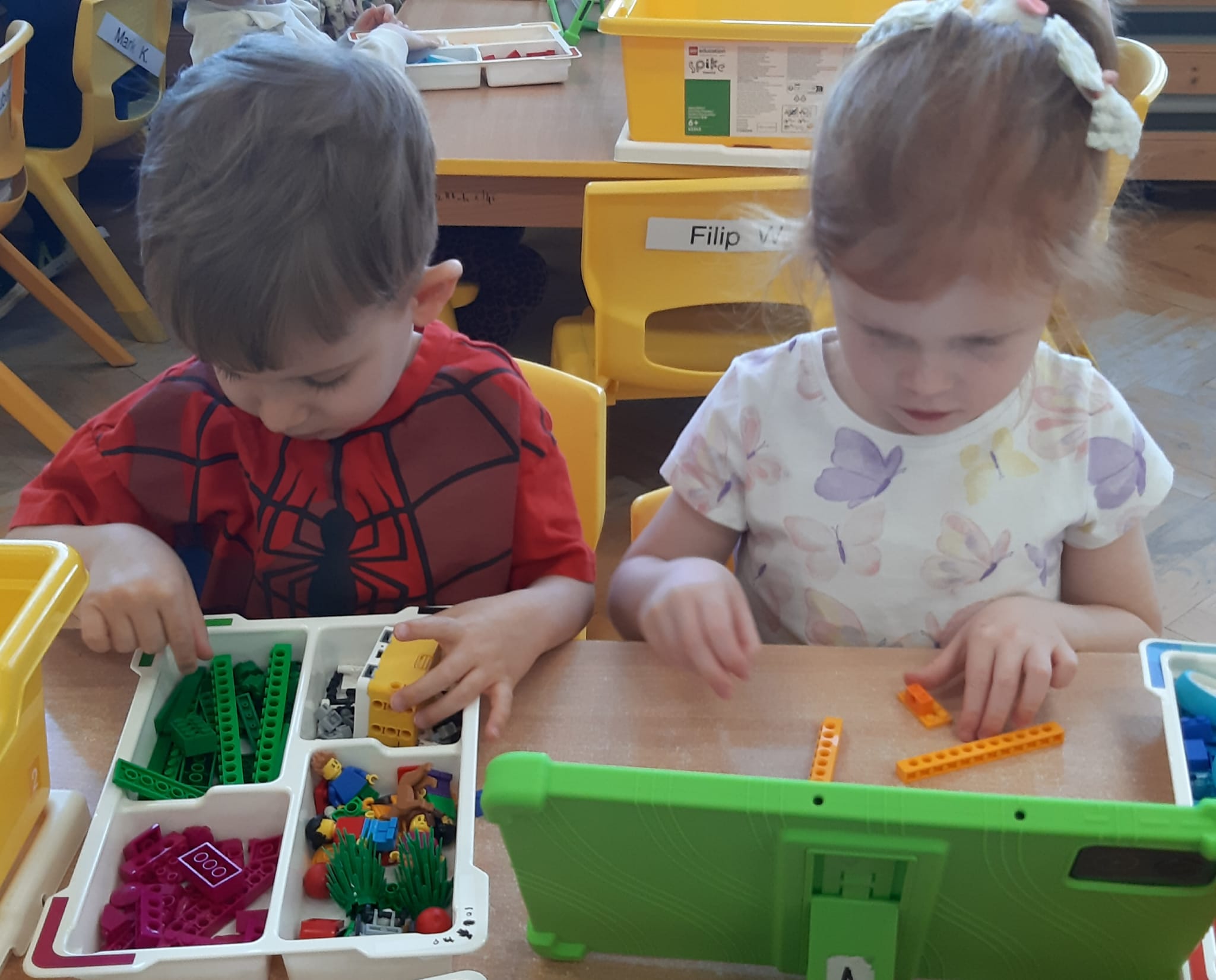 Przedszkolaki z ogromnym zaangażowaniem budowały różnorodne konstrukcje – powstawały domy, pojazdy, wieże, a także fantastyczne budowle stworzone według własnej wyobraźni. Wspólna zabawa klockami rozwijała kreatywność, wyobraźnię przestrzenną oraz umiejętność współpracy w grupie.