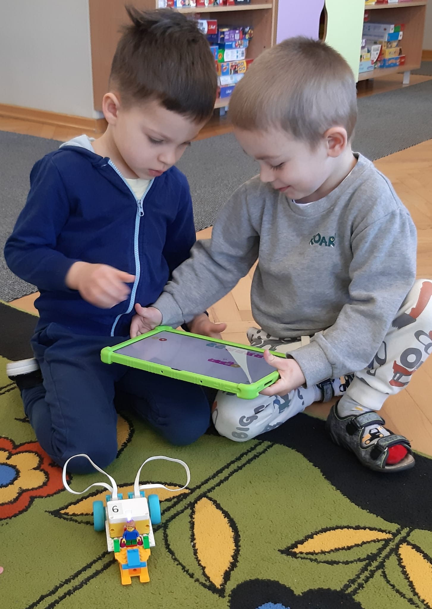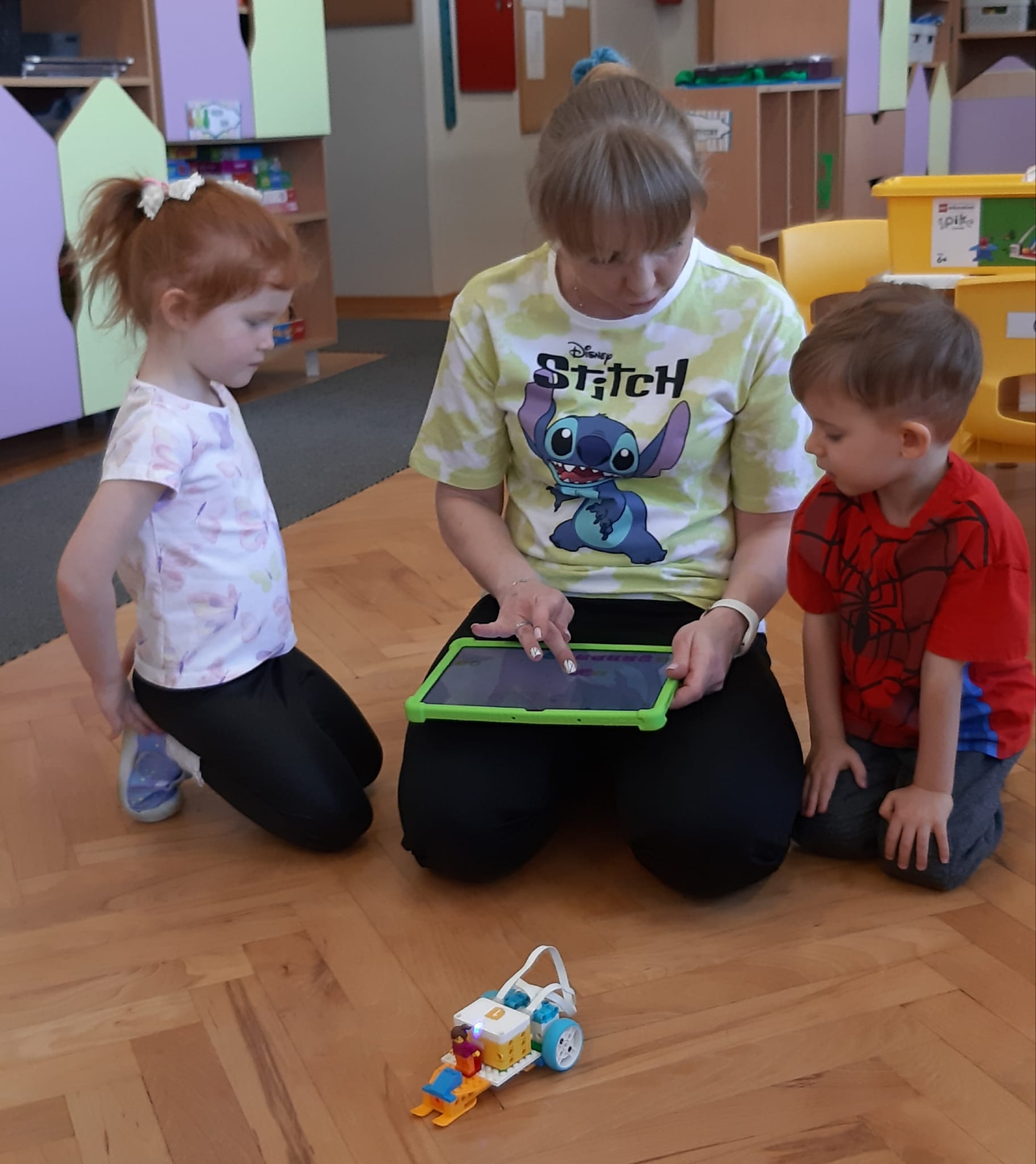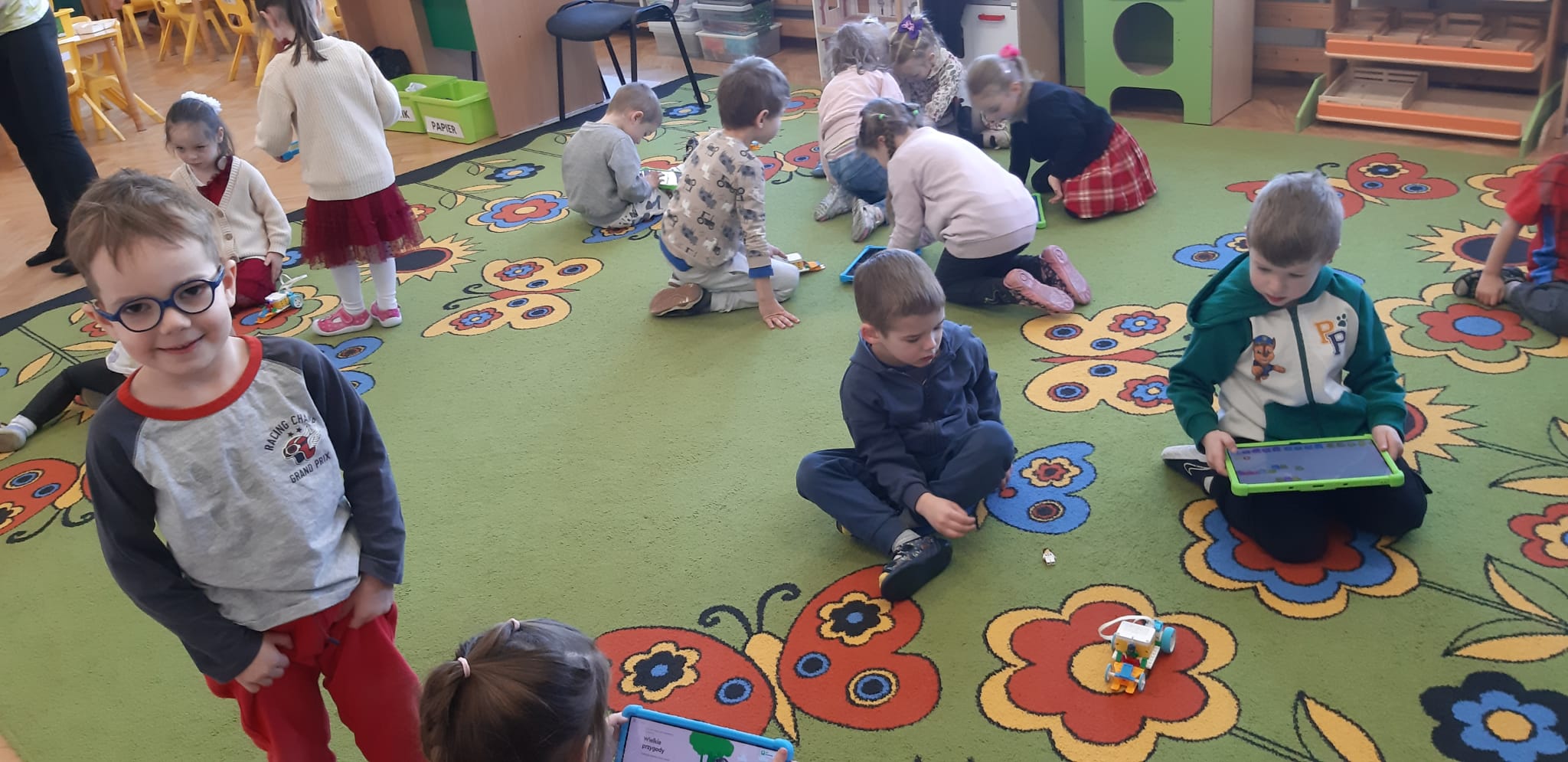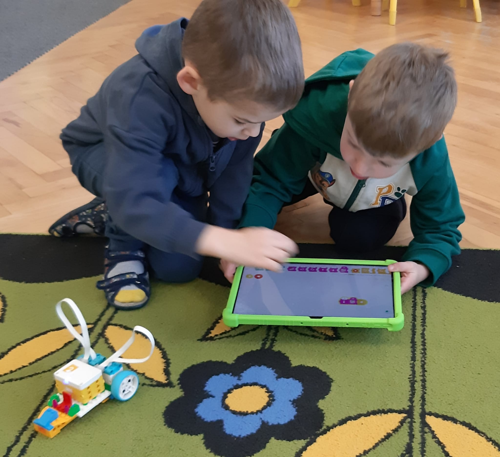Przedszkolaki z ogromnym zaangażowaniem budowały różnorodne konstrukcje – powstawały domy, pojazdy, wieże, a także fantastyczne budowle stworzone według własnej wyobraźni. Wspólna zabawa klockami rozwijała kreatywność, wyobraźnię przestrzenną oraz umiejętność współpracy w grupie.
