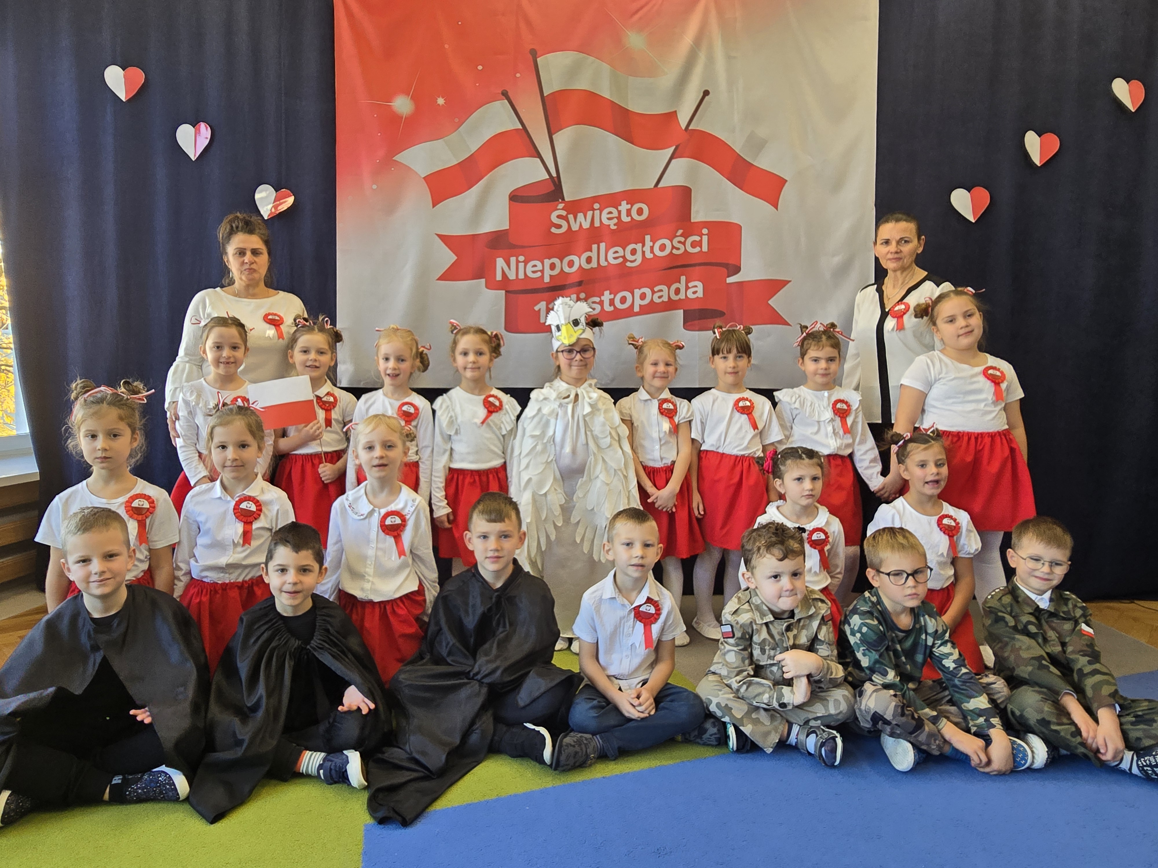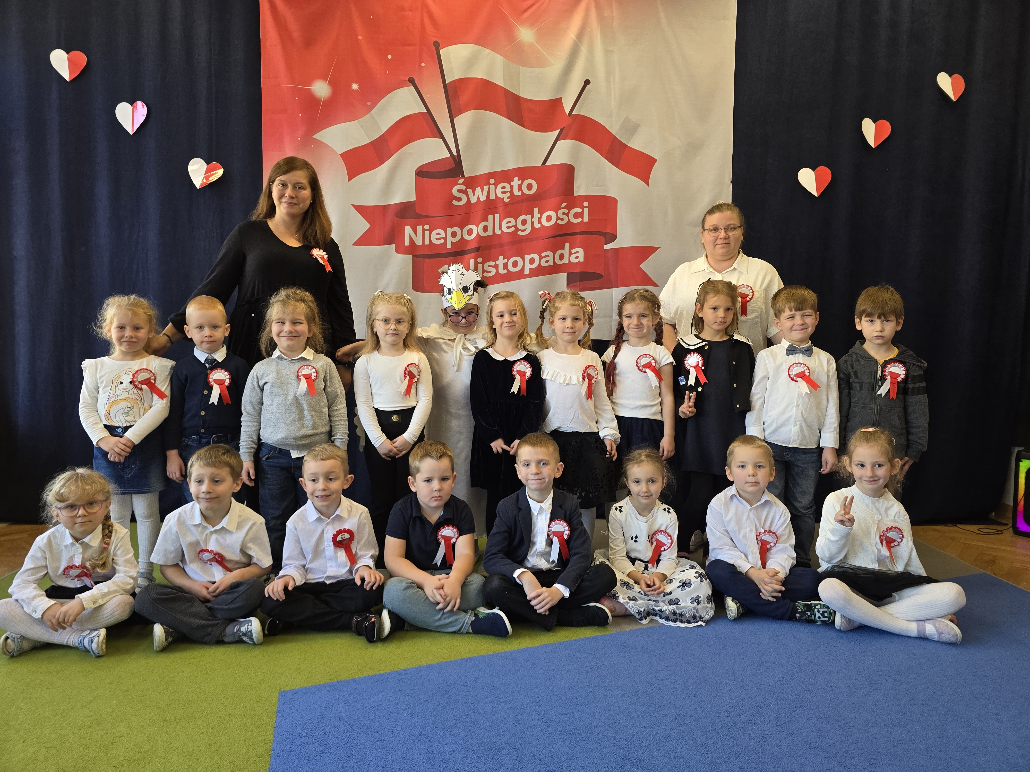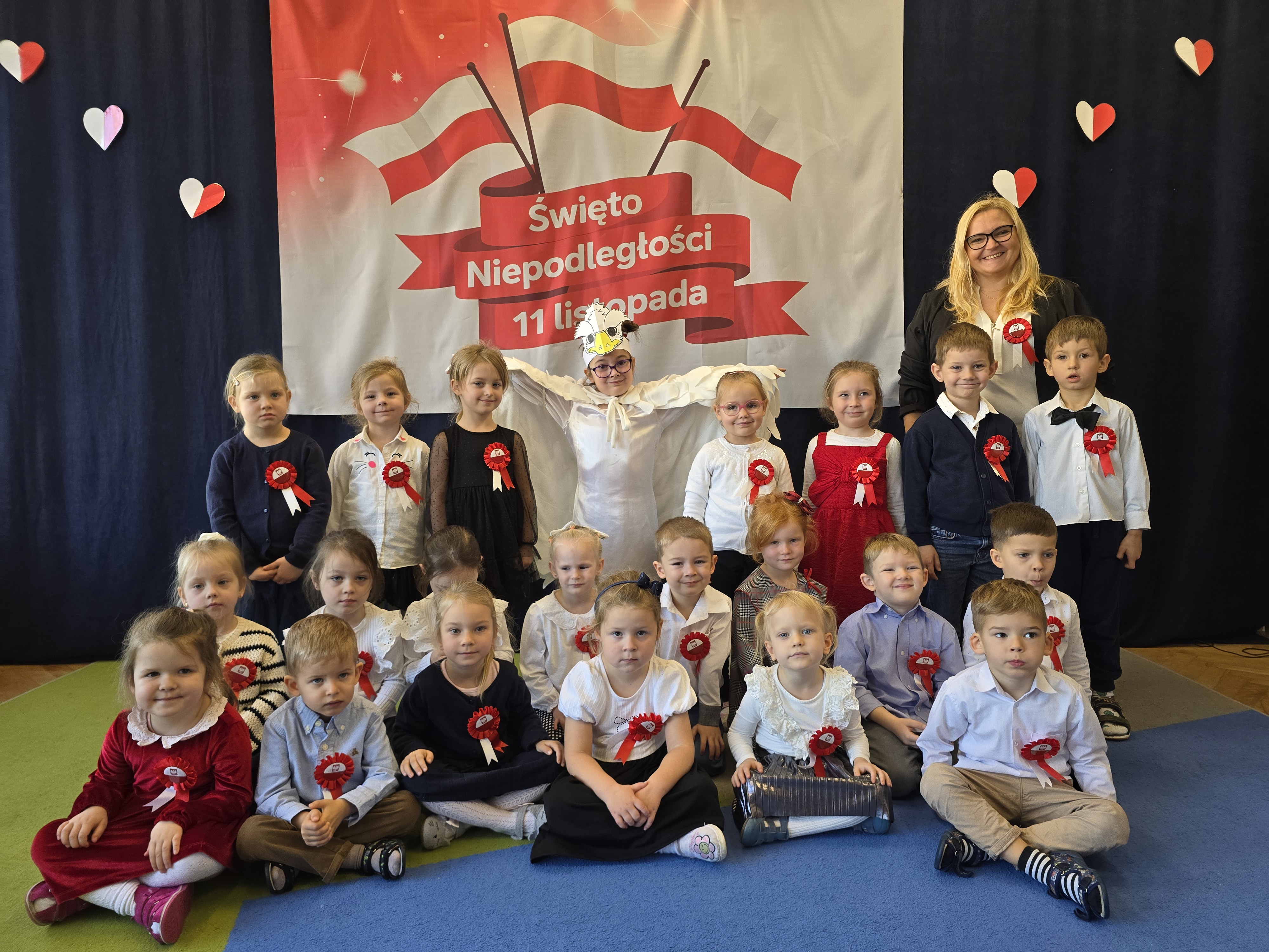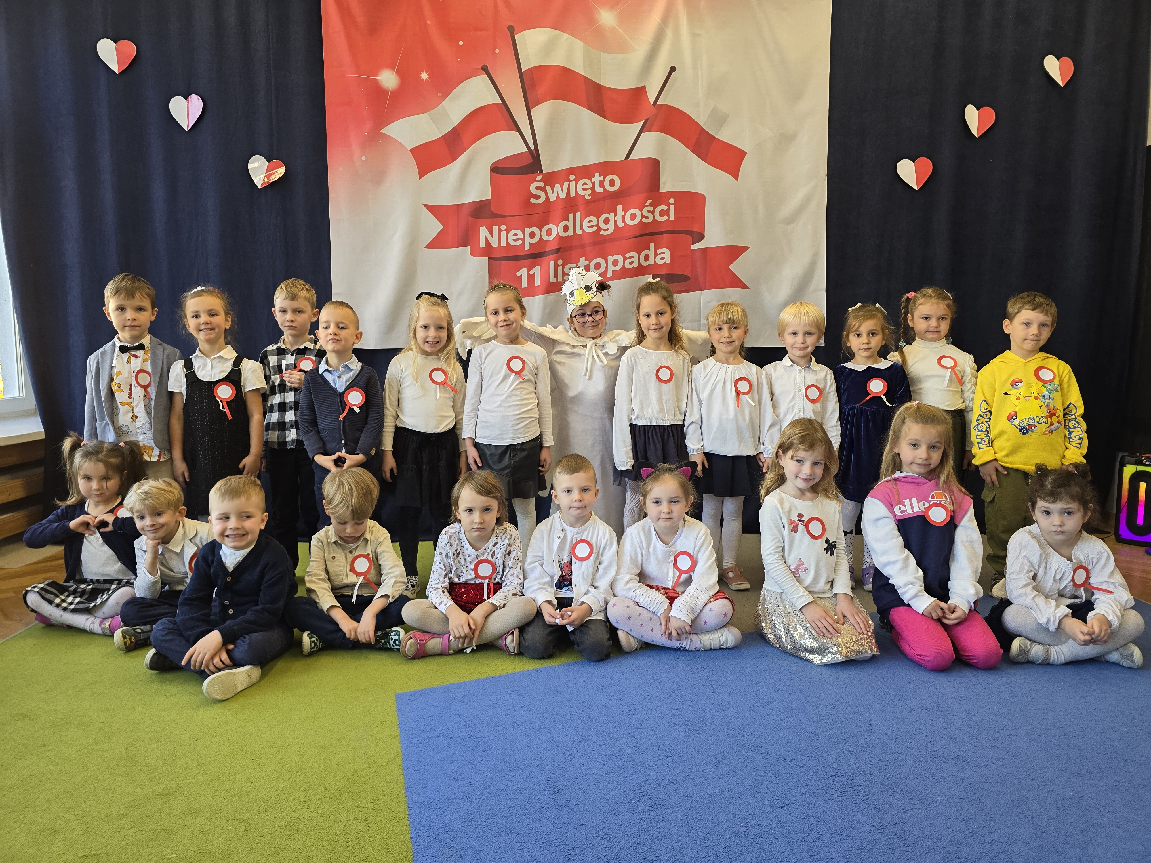 Dnia 7 listopada 2025 roku obchodziliśmy Święto Niepodległości. Dzieci ubrane w biało-czerwone barwy wspólnie odśpiewały hymn oraz obejrzały występ artystyczny przygotowany przez grupę V. Cała uroczystość przebiegła w radosnej, podniosłej atmosferze, podkreślając znaczenie wolności i miłości do ojczyzny.