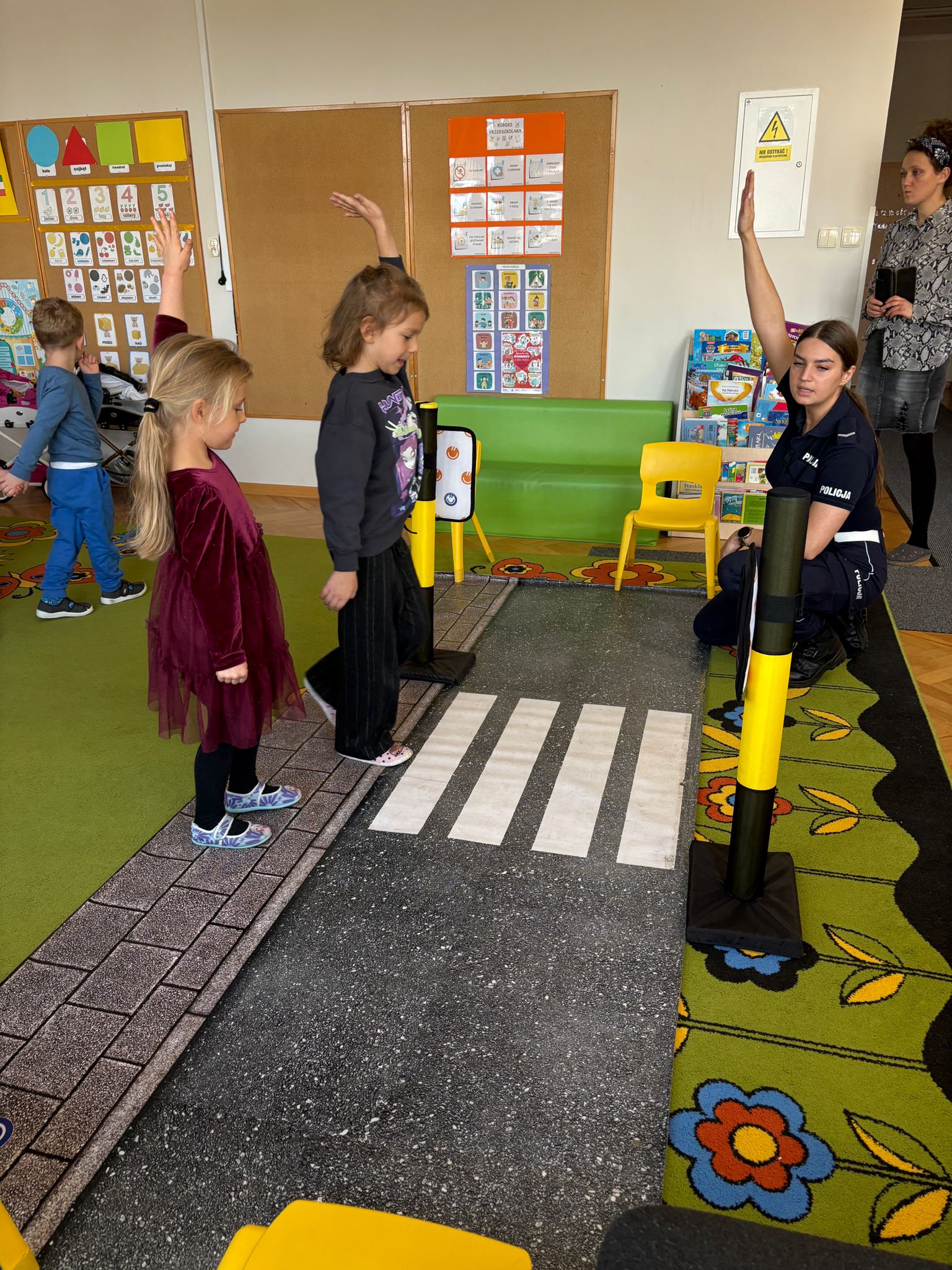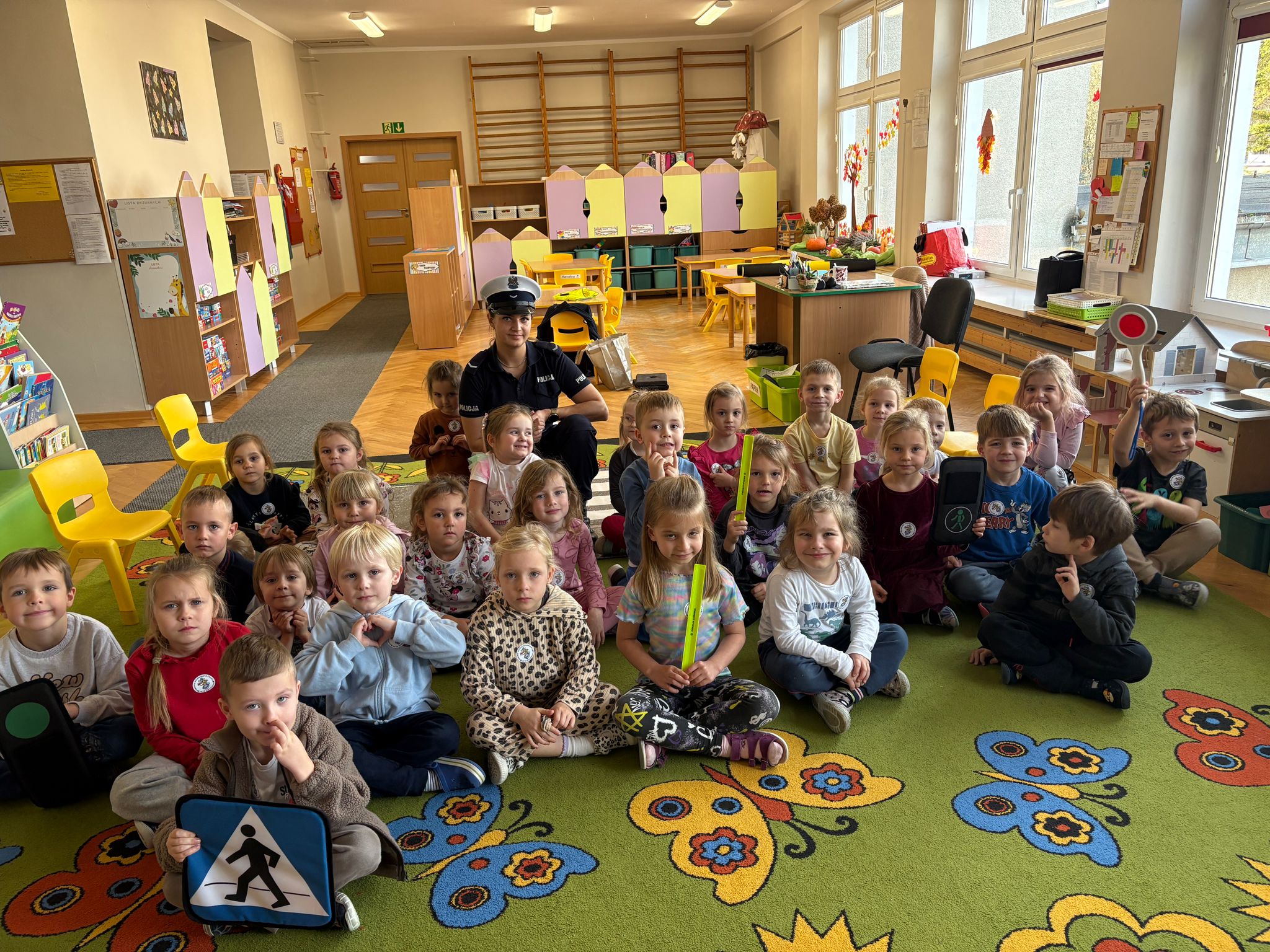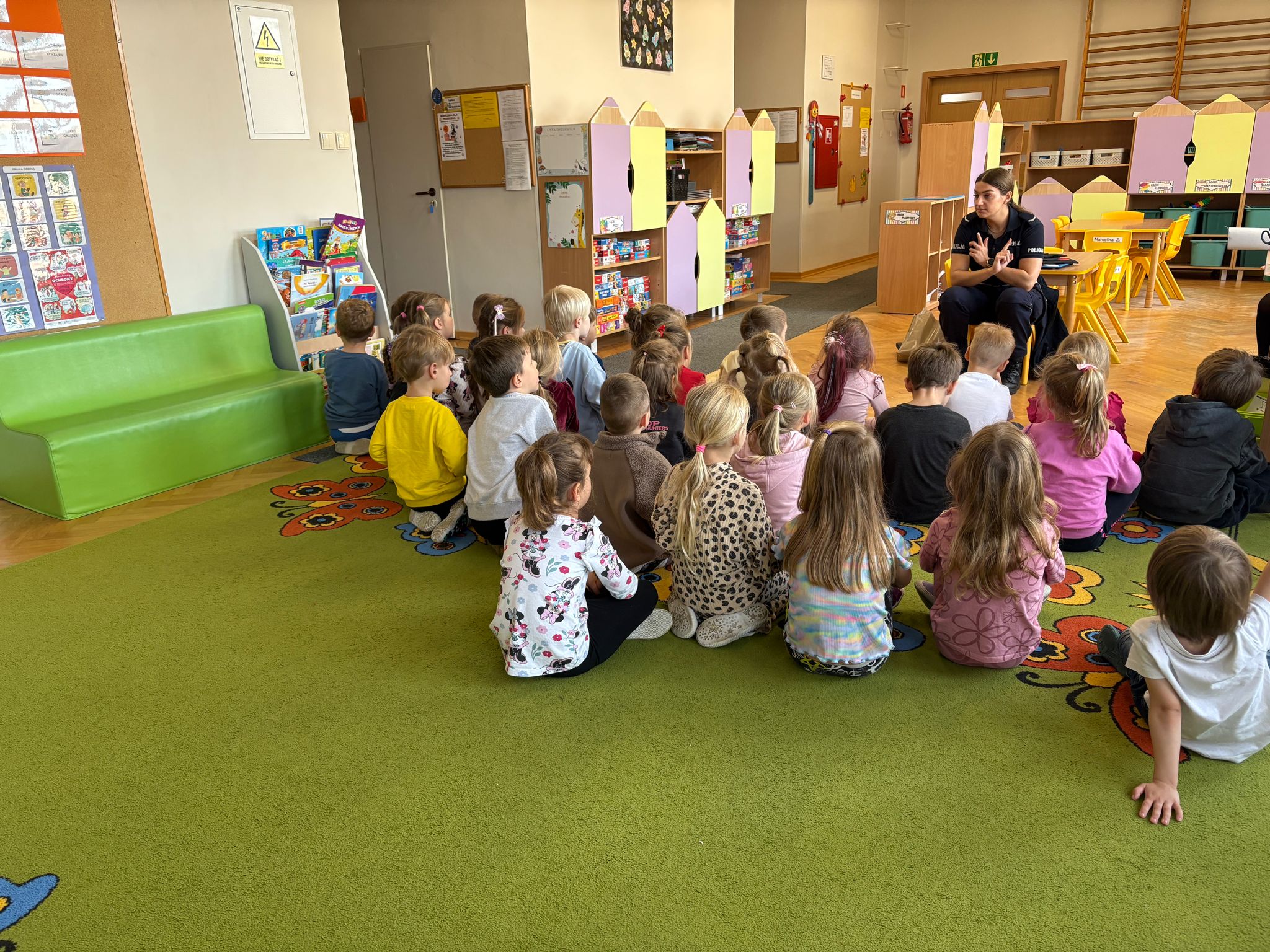 14 listopada w naszym przedszkolu odbyło się spotkanie z policjantką, która przeprowadziła pouczające zajęcia dla dzieci na temat zasad ruchu drogowego. Przedszkolaki dowiedziały się, jak bezpiecznie przechodzić przez ulicę, jakie znaczenie mają sygnalizacja świetlna i znaki drogowe oraz w jak sposób zachowywać się w ruchu drogowym. Spotkanie odbyło się w formie zabaw i krótkich ćwiczeń praktycznych, co pozwoliło dzieciom lepiej zapamiętać zasady bezpieczeństwa. To było ciekawe i bardzo ważne doświadczenie, które uczyło odpowiedzialności i ostrożności na drodze.