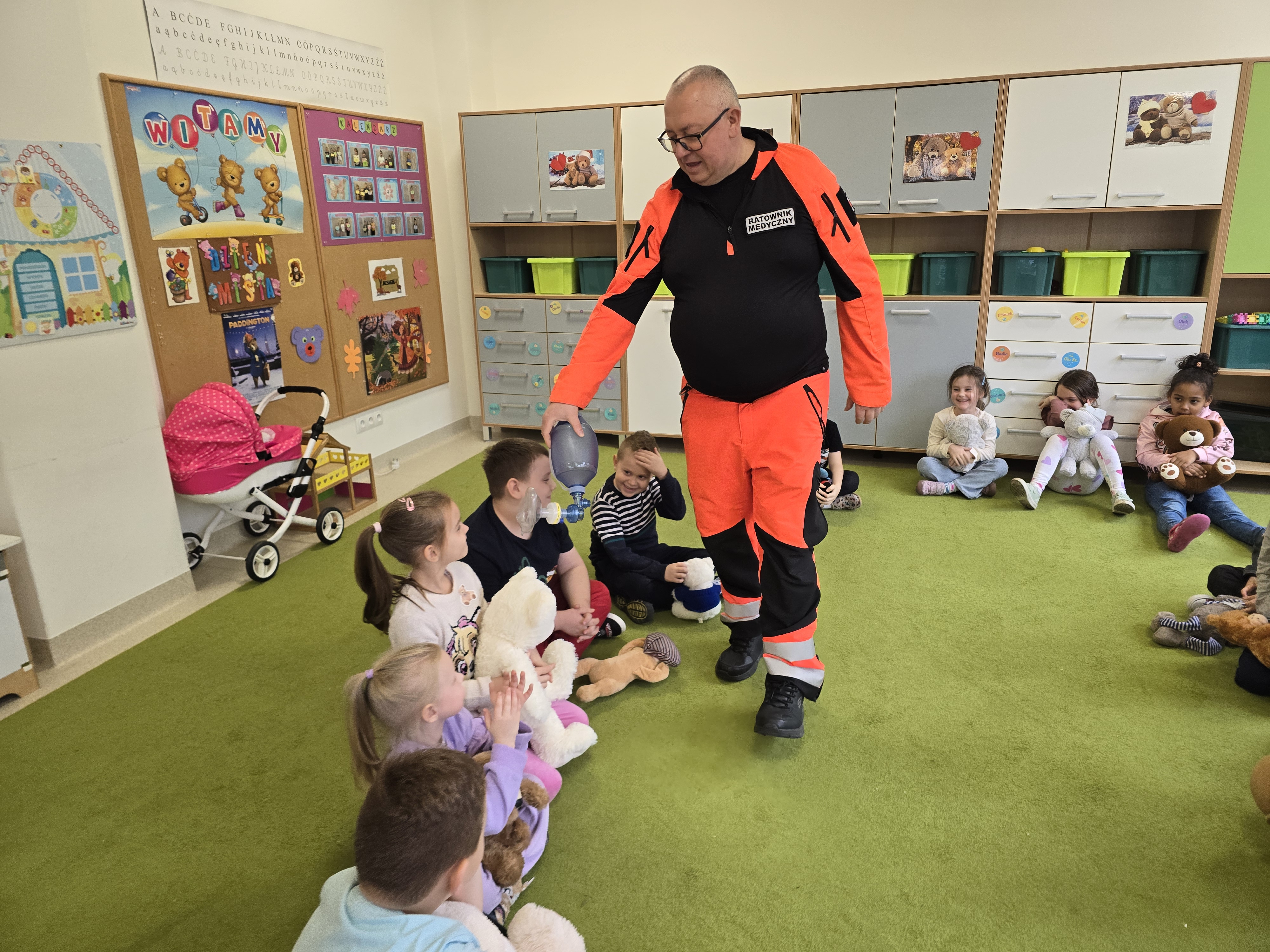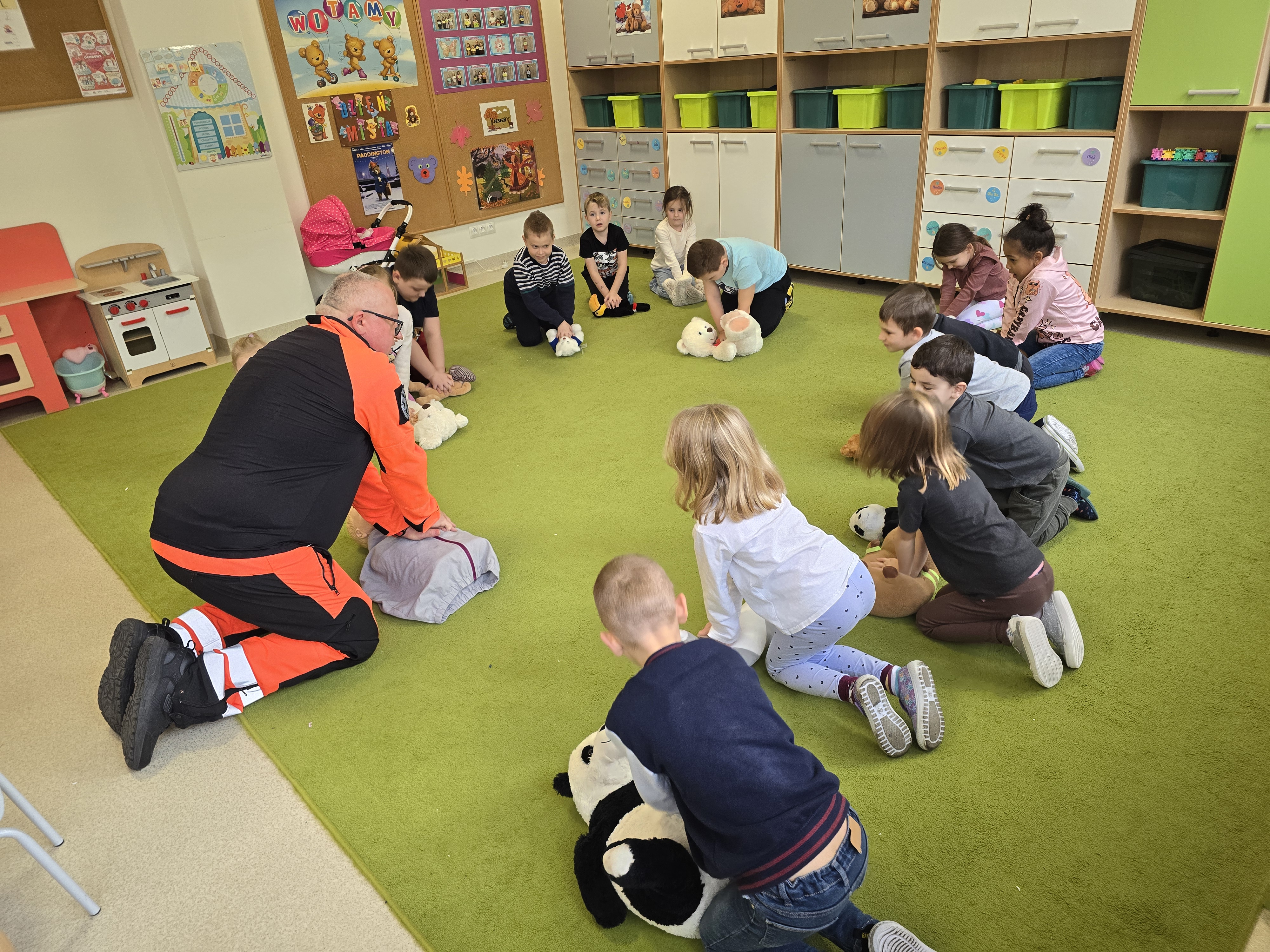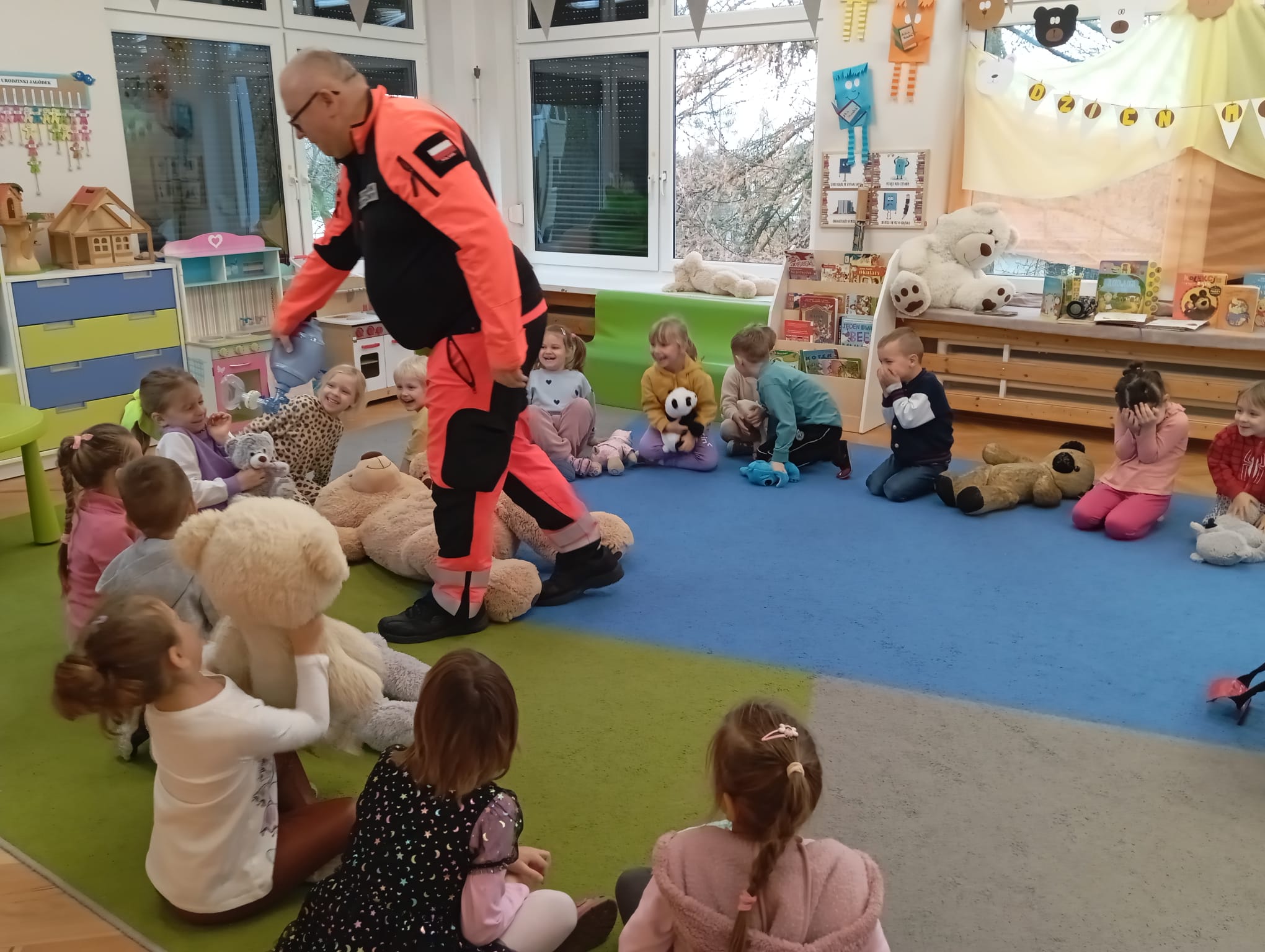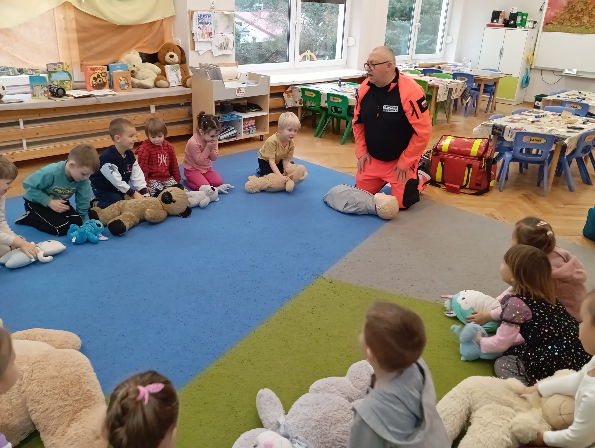 W naszym przedszkolu odbyły się zajęcia z pierwszej pomocy prowadzone przez ratownika medycznego. Dzieci uczyły się, jak pomagać potrzebującym, wykorzystując w ćwiczeniach swoje pluszowe misie. Przedszkolaki poznawały podstawowe zasady udzielania pierwszej pomocy. Zajęcia były pełne zabawy i praktycznych ćwiczeń, dzięki czemu dzieci w przystępny sposób zdobyły istotną wiedzę o ratowaniu życia.