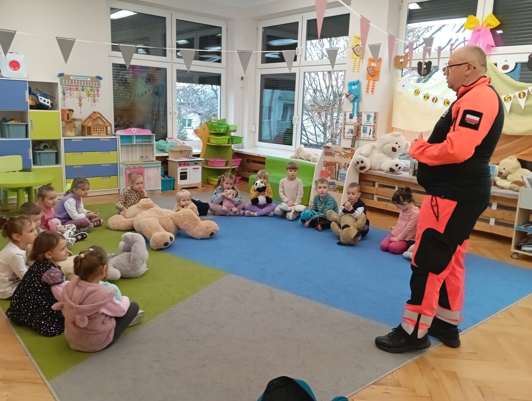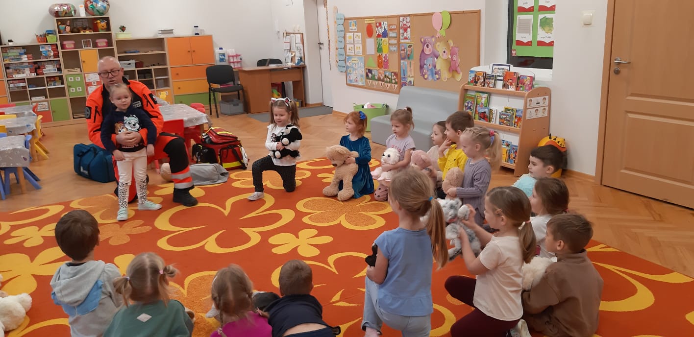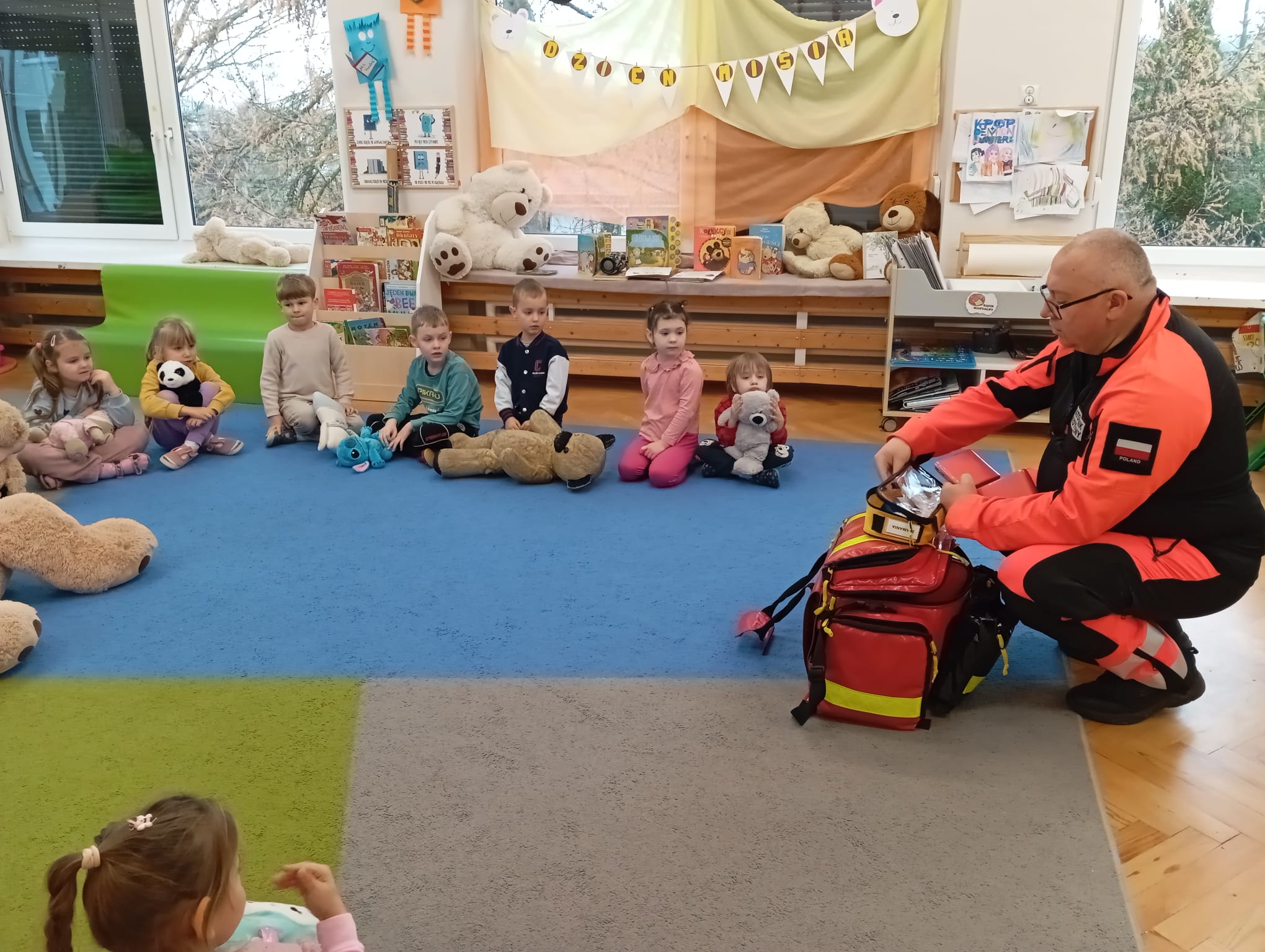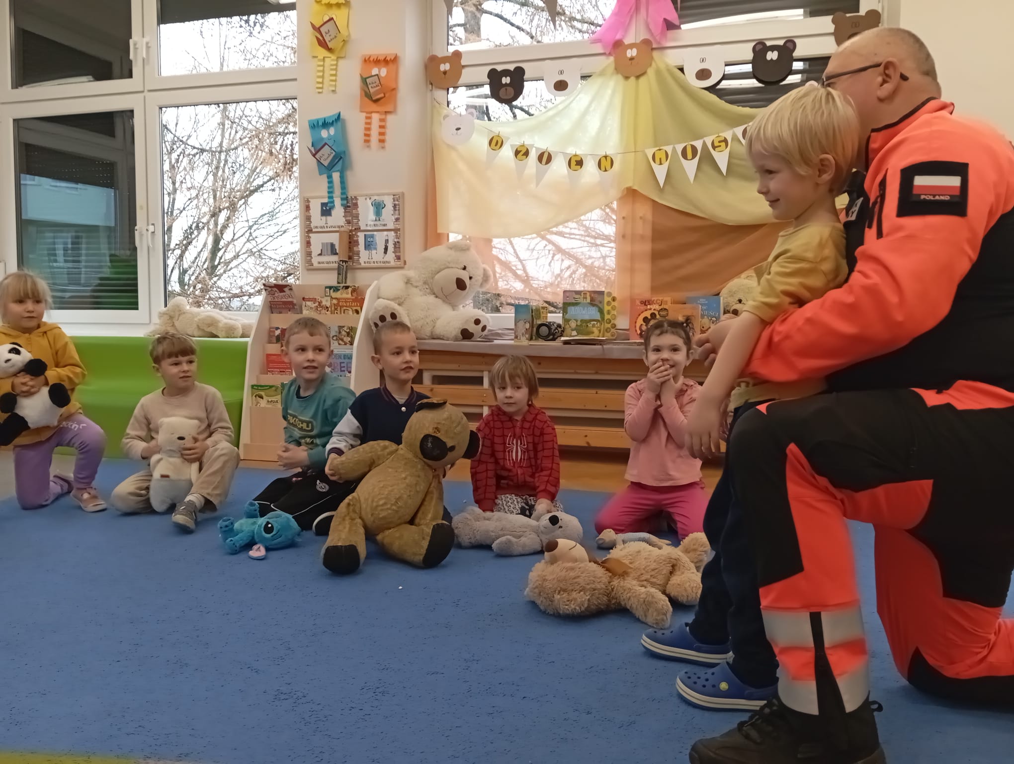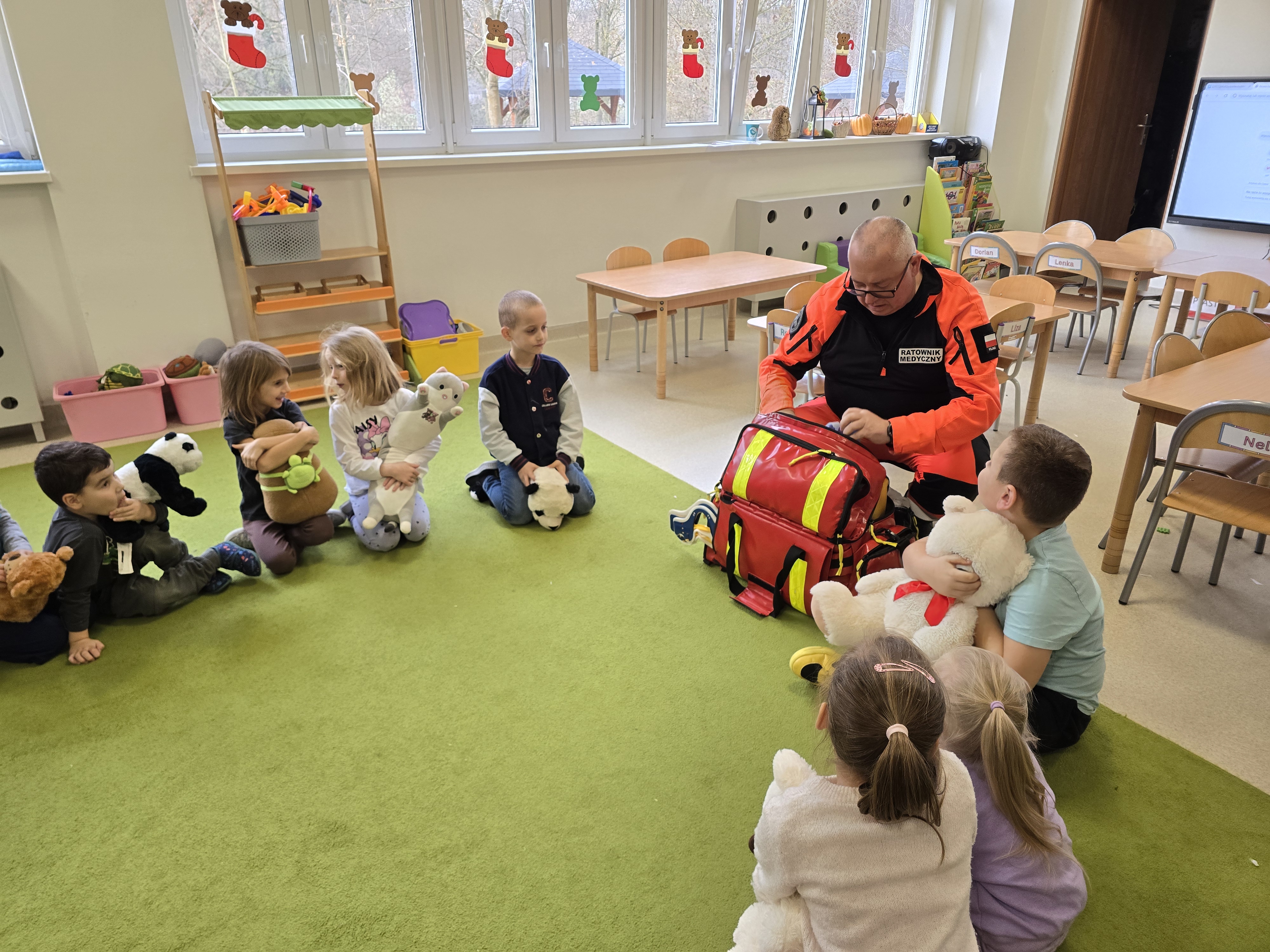 W naszym przedszkolu odbyły się zajęcia z pierwszej pomocy prowadzone przez ratownika medycznego. Dzieci uczyły się, jak pomagać potrzebującym, wykorzystując w ćwiczeniach swoje pluszowe misie. Przedszkolaki poznawały podstawowe zasady udzielania pierwszej pomocy. Zajęcia były pełne zabawy i praktycznych ćwiczeń, dzięki czemu dzieci w przystępny sposób zdobyły istotną wiedzę o ratowaniu życia.