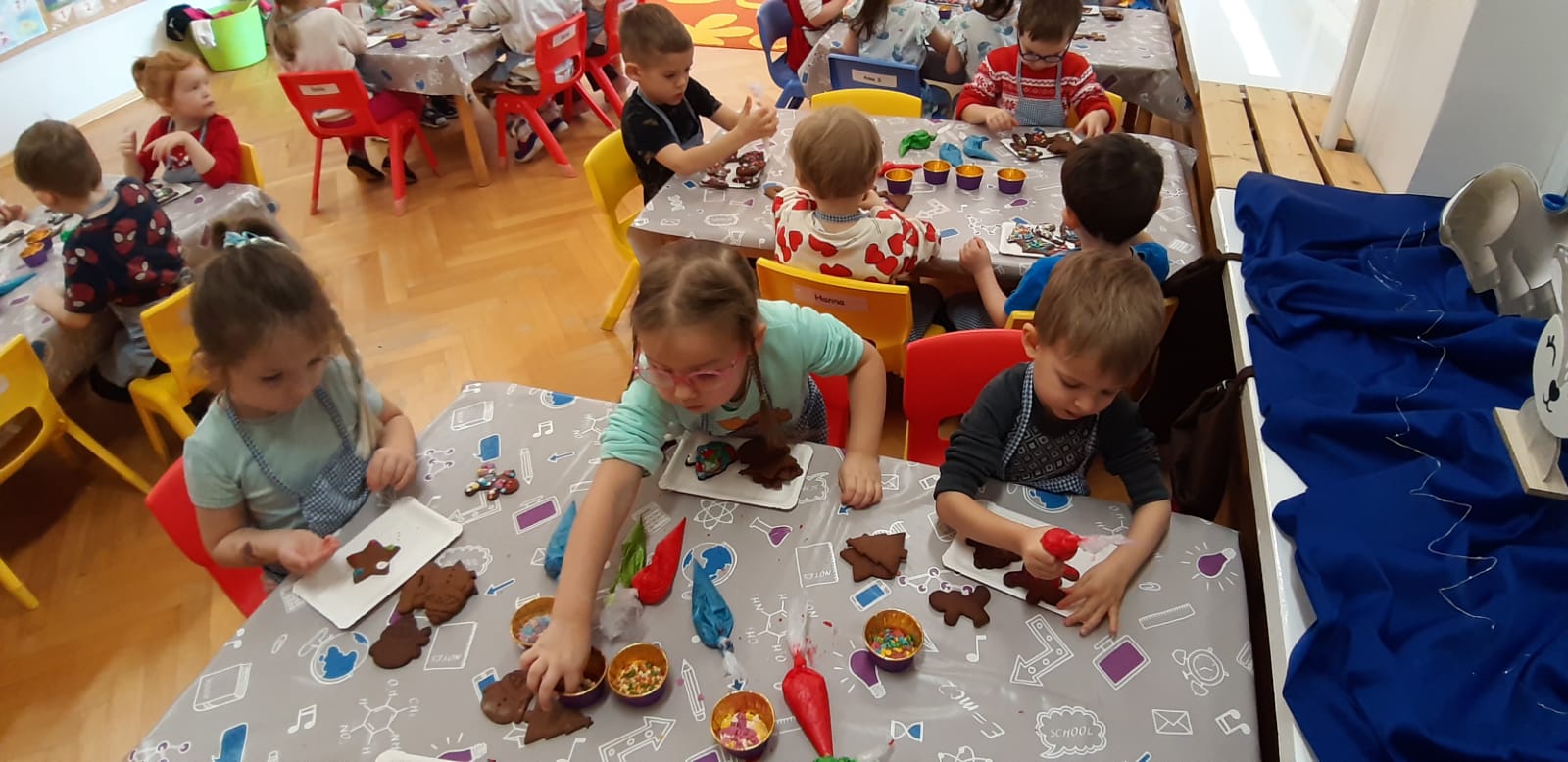 Najwięcej radości sprawiło dzieciom ozdabianie wypieczonych ciasteczek kolorowym lukrem, posypkami oraz słodkimi dekoracjami. Każdy pierniczek był wyjątkowy i wykonany z ogromnym zaangażowaniem. Warsztaty były nie tylko świetną zabawą, ale także okazją do rozwijania zdolności manualnych, kreatywności oraz współpracy w grupie.